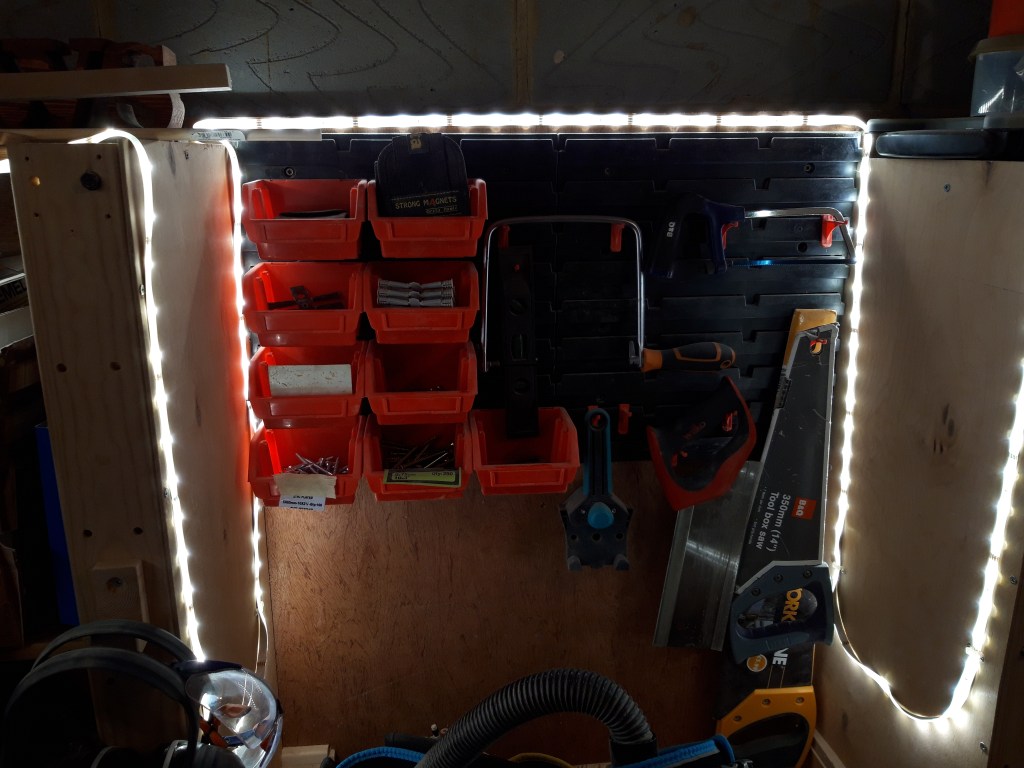 I now have a much brighter workshop, which should make it a lot easier to see what I’m doing and allow me to find tools and fixtures a lot more easily. I’m very impressed with the LED reel, which I picked up while looking for something else. You can also get ones in different colours, but I’m happy with the clear white ones and they also give the mitre saw bench a sort of comforting glow I think! 🔨