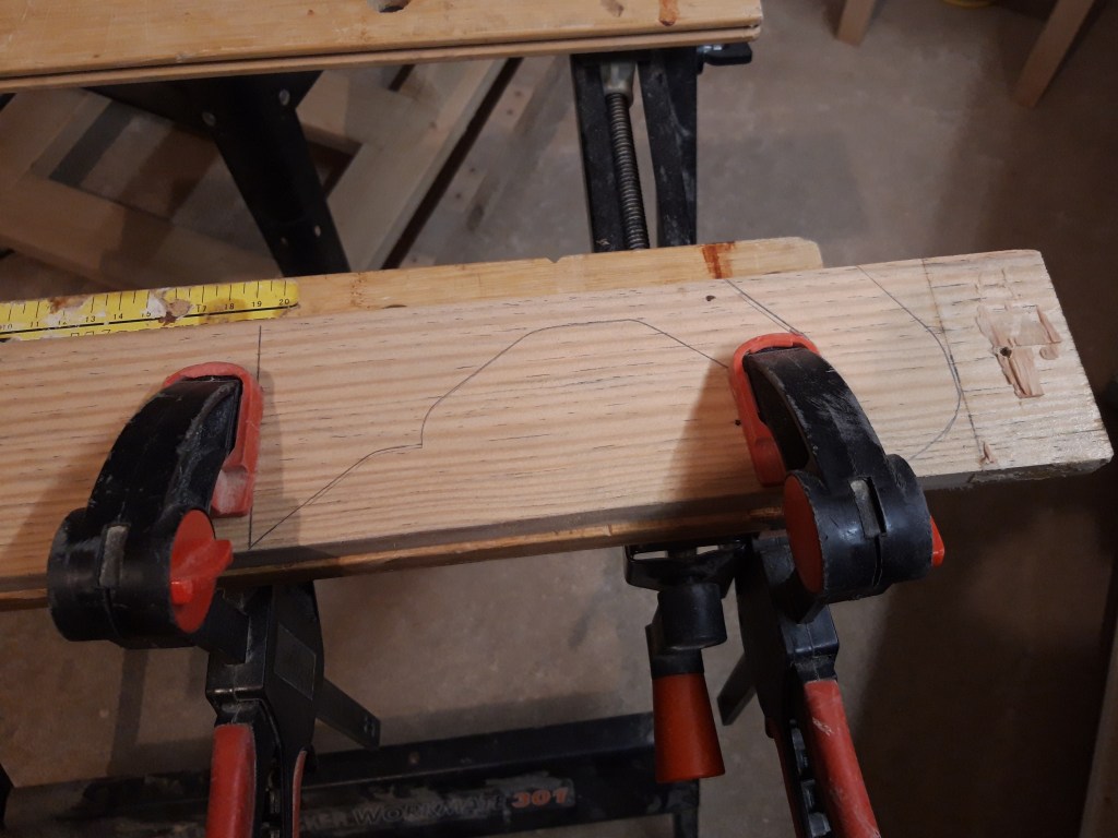 The design is based off the very excellent one made by Drew Fisher from the YouTube channel Fisher’s Shop (website and YouTube video). Drew provided a pdf template of his design (link on his video), which I used as the start for mine. After transferring the shape onto some scrap pallet wood, I cut out the shape using my coping saw. I didn’t have a piece of scrap wide enough so I temporarily glued an extra piece on while drawing out the design and cutting it out.