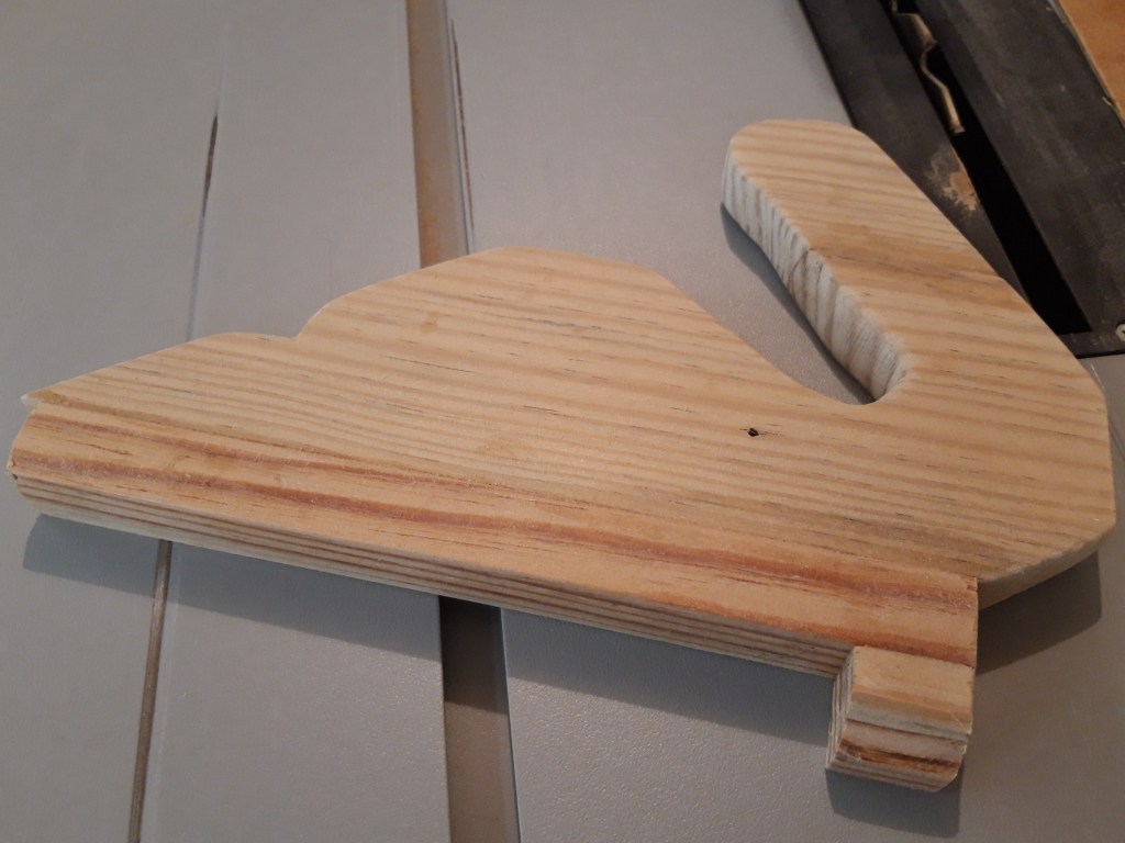 Once I had the shape fully cut out, I sanded it to make it comfortable to hold – I intend to use this a lot so want to make sure that it feels good in the hand. I drilled a hole in the top of the handle and a complimentary one in the extra handle piece to then glue a dowel into. I added glue into the joint and clamped the two pieces of the push stick together. While the glue dried, I cut a strip of pallet wood the same width as the push stick and an extra block to fit to the back of the push stick to guide a workpiece into the saw blade. I glued the two extra pieces onto the bottom of the push stick and once the glue dried, gave it another sanding to ensue there were no rough edges.