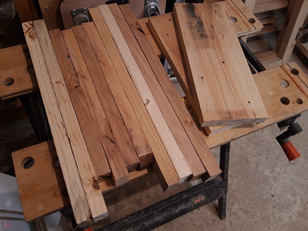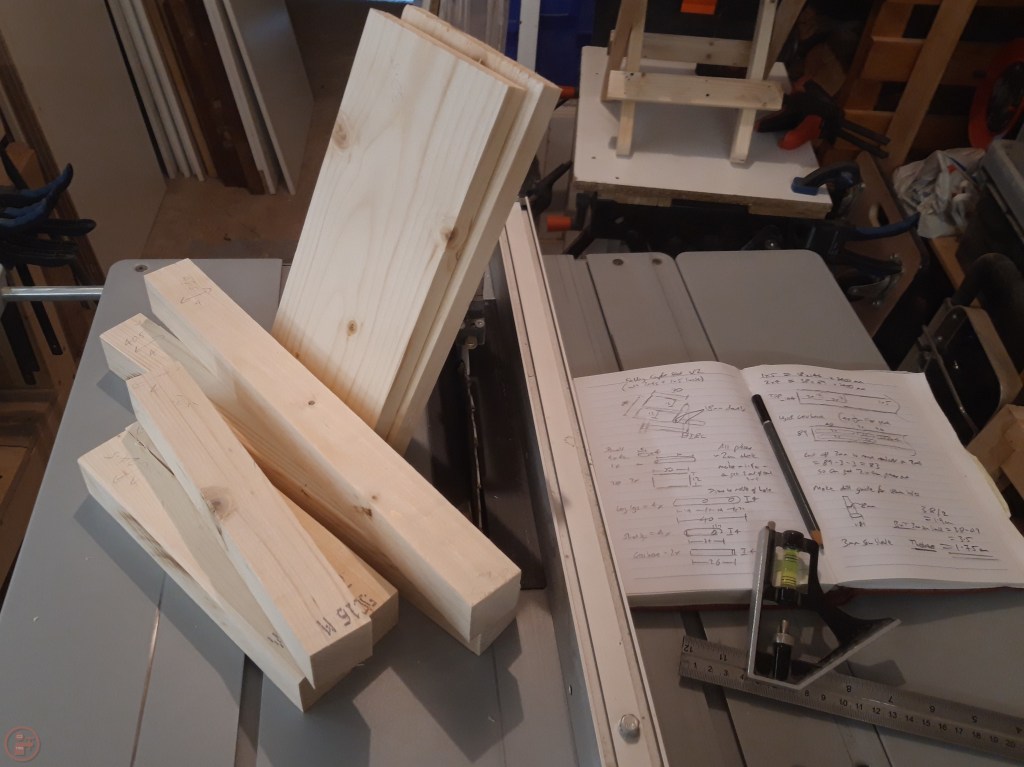 For the final version to be given as a present, I therefore opted to use dimensional lumber. I had an offcut of a 2×4 left over from a previous project and purchased a new 2×6 to use for the flat seat pieces. I ripped the 2×4 into thinner pieces using my table saw and then cut them to length using a stop block on the mitre saw. This meant I could ensure all the legs were exactly the same length.