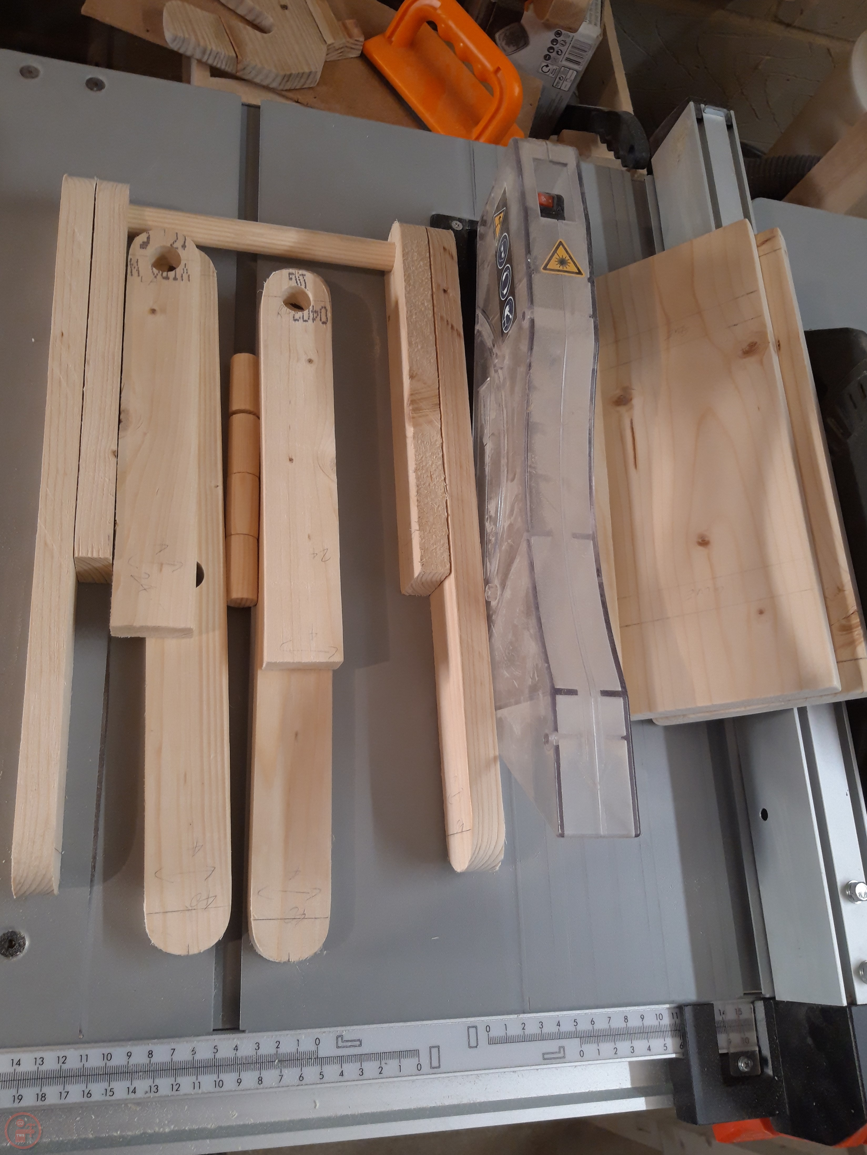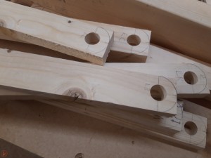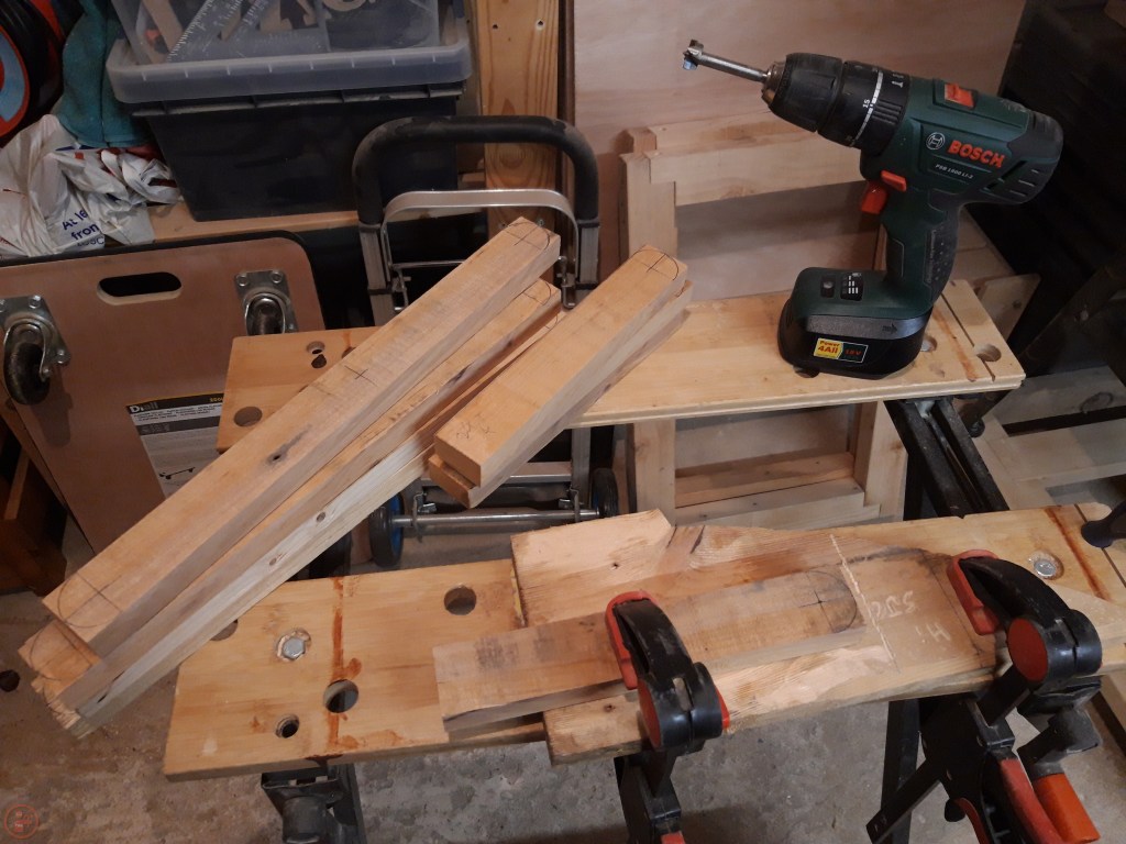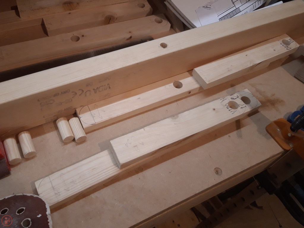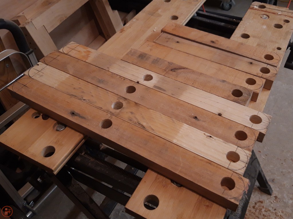 I raided my scrap collection and after finding some suitable rough sizes of lumber, I cut them to length on my mitre saw and then ripped them to width using my table saw. I measured where I wanted to drill the holes for the dowels to go through and used a circle template in the correct size to draw the curve on the end of the various leg pieces.