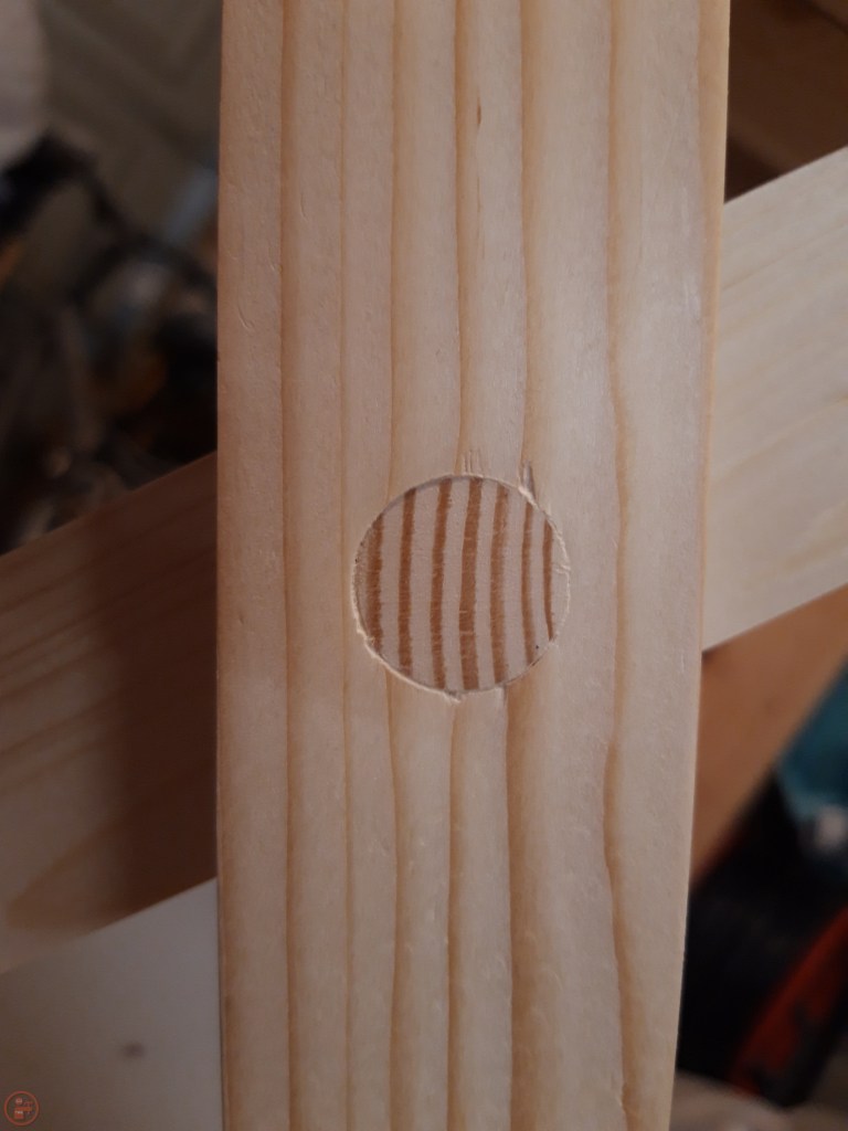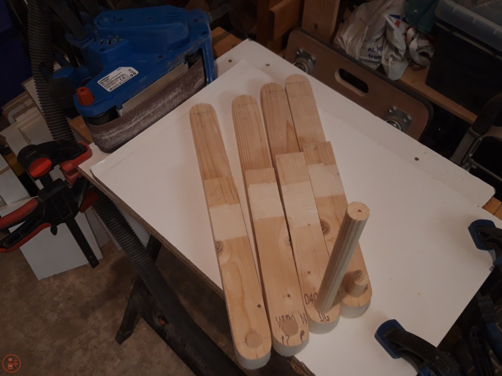I then drilled out the dowel holes using a Forstner bit – this was quite tricky as I had to try hard to keep the drill at exactly 90 degrees so as to make sure the dowels would fit at the correct angle to allow the pieces to pivot freely once attached. This would have been much easier with a drill press but that is still on my list of “nice to have” tools at the moment!