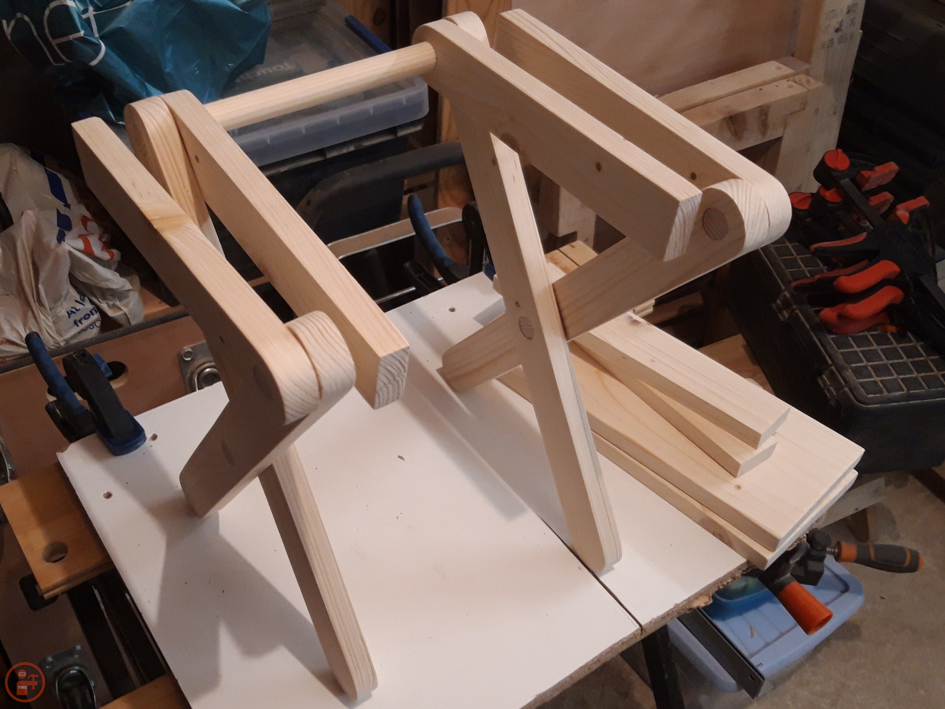 I slid the dowels into the drilled holes with some gentle persuasion using a rubber mallet and assembled the legs and the longer central dowel to test fit all the pieces. There was a bit of variation in the legs due to the imperfect holes I had drilled and because the scrap lumber, despite my efforts, had some twist and cupping to it.