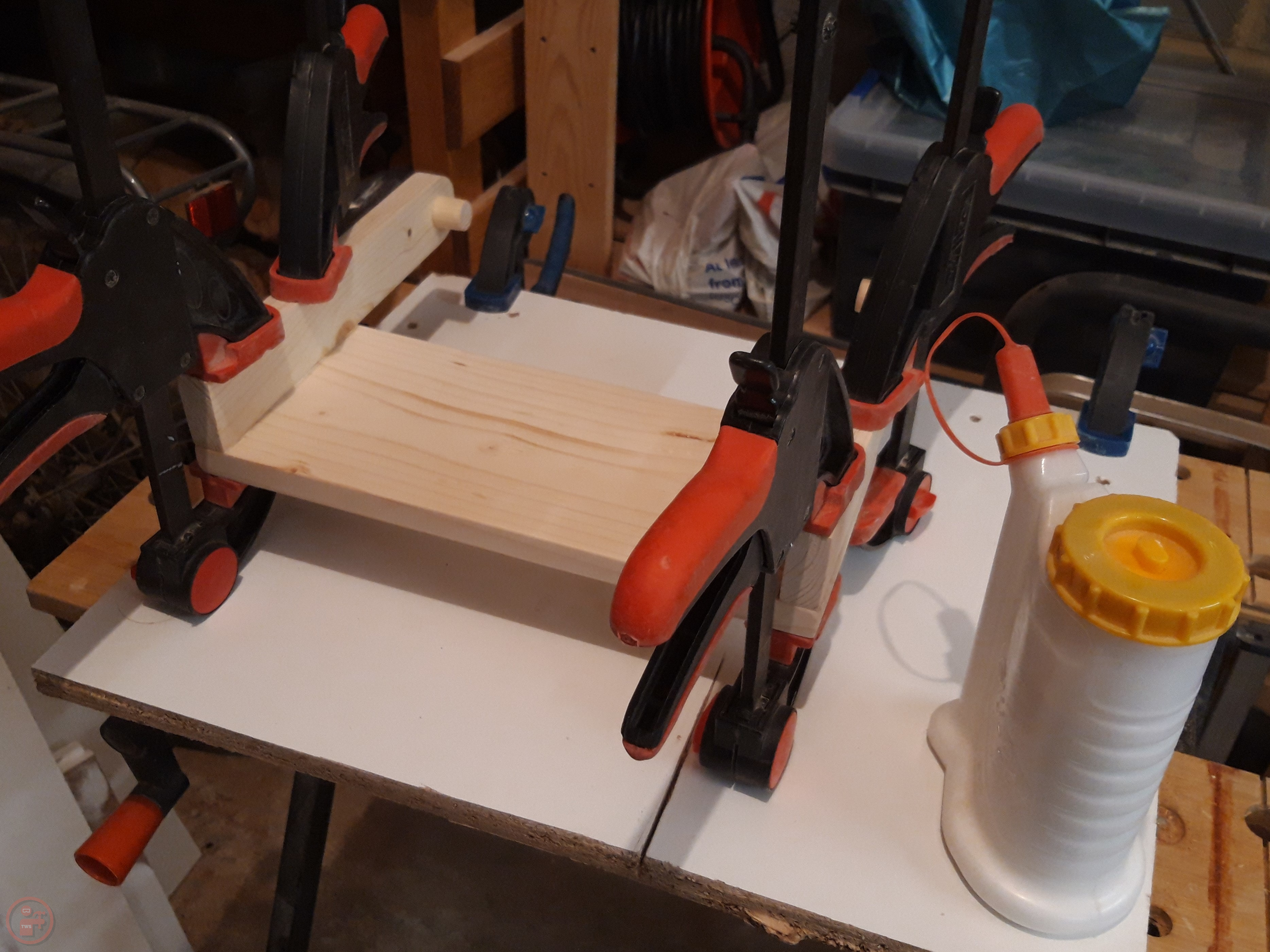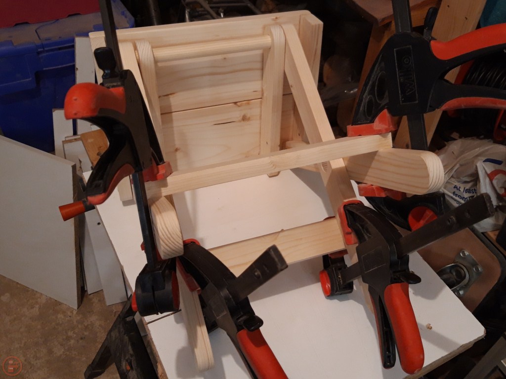 I glued on the seat pieces and the lower braces, which were held with clamps while the glue dried.