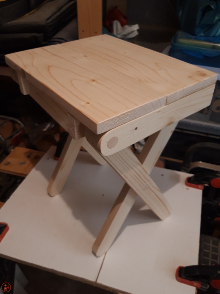 The finished prototype showed me that the idea was possible, but that I needed to drill more accurate holes and to make time to fully ensure the lumber was dimensionally stable and without any twists, bowing or cupping, as that prevented the folding from working smoothly where the legs rubbed against each other. Also, despite cutting the legs to the same length, due to the bowing on one of them, the stool was slightly lopsided!