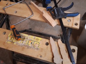 I used a Stanley knife to mark the pattern into the blade and handle areas and then thinned the blade section down by cutting off a section of material on each side using my coping saw. This was a little fiddly as I don’t yet have a dedicated workbench (work in progress!) so was still using my workmate, which although a fairly stable surface most of the time, has limited clamping options for securing a workpiece. I took it slowly however and was able to successfully reduce the blade thickness to what I was imagining.
