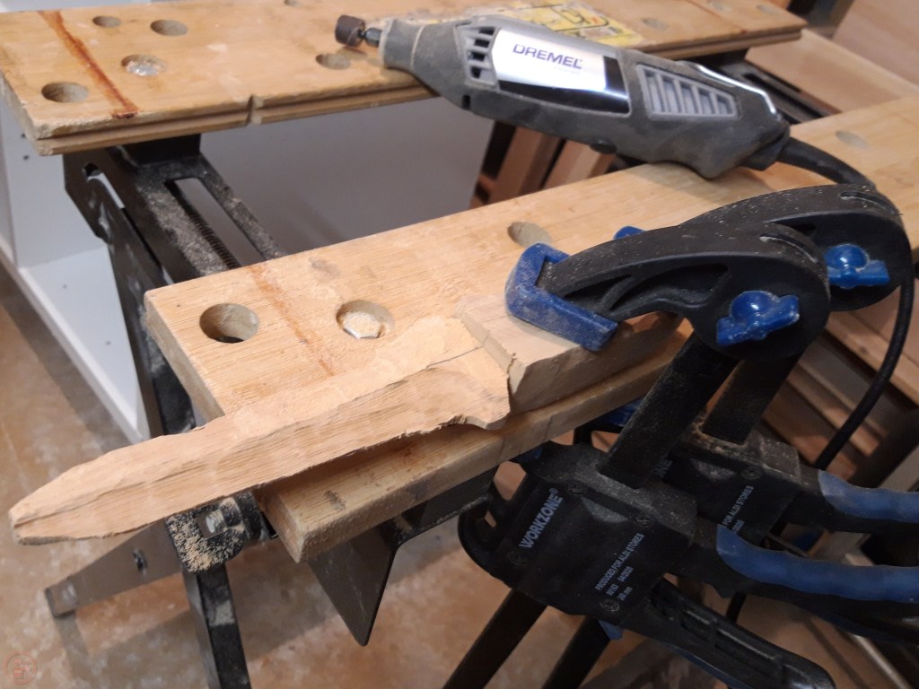 I spent quite a bit of time working out how best to get the blade shape how I wanted it. I drilled out a section at the top of the blade and then inserted my coping saw to refine the shape of the cut out section. This was quite tricky to rotate the workpiece to the right angle to be able to saw effectively and I found a combination of drilling and then using a round wood-carving bit in my Dremel worked well and was a lot easier to get the shape I wanted.