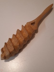 The final part of the workpiece to shape was the handle – I wanted this to be a spiral shape going up the handle to a point at the end. I used a Stanley knife to cut grooves into the handle and then carefully removed more and more material, following the drawn on pattern and cut out grooves as I rotated the letter opener.