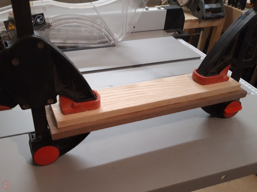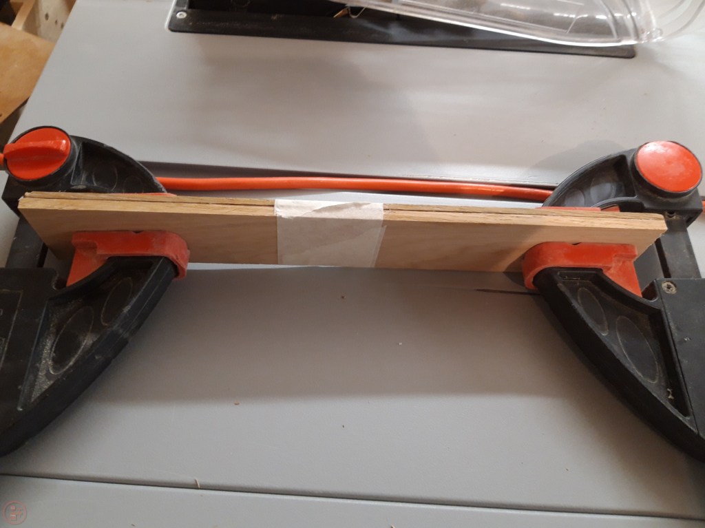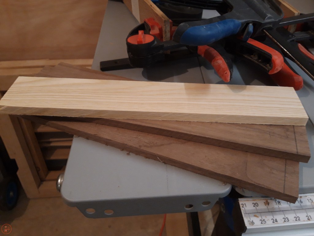 I had a selection of different hardwoods that I wanted to use for the gift box, that would provide a nice contrast with each other for the lid and body of the box. I selected some oak and maple panels for the sides of the box and glued them together to provide a thicker piece, holding the pieces together with tape and clamps while the glue dried. I ripped the piece of walnut into two pieces for the base and the top of the lid and then selected a piece of beech for the inside section of the lid to fit inside the box sides.