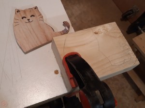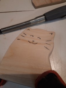 I received a Dremel for my birthday last year and I have used it quite a lot to add smaller details to projects. I decided to try adding the face details to this version of the cat phone holder and sketched them out in pencil first, before adding grooves into the pine using a small carving tool.