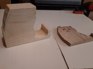 I used the mdf template I created last time and extended the tail so the phone could lean back more against the cat body. I used a piece of pine 2×4 left over from a previous project as the width provides a solid and stable base for supporting a phone.