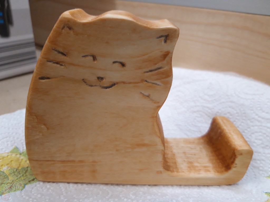 I finished the phone holder with Danish oil to darken the colour slightly, leaving it overnight to fully dry. The cat phone holder now lives on our kitchen counter and is used almost constantly now by my wife when cooking and when I am washing up! 🔨