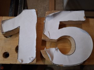 I took some rough dimensions of the wall outside the front door and then printed off a template to use to cut out the numbers one and five, for our house number fifteen. I used some scrap pallet wood and followed the lines of the number templates using my jigsaw. I took my time and then hand sanded the numbers, especially inside the curved section of the five, as I don’t have any power tools that can sand the inside of a curve.