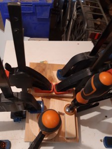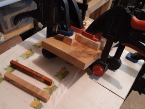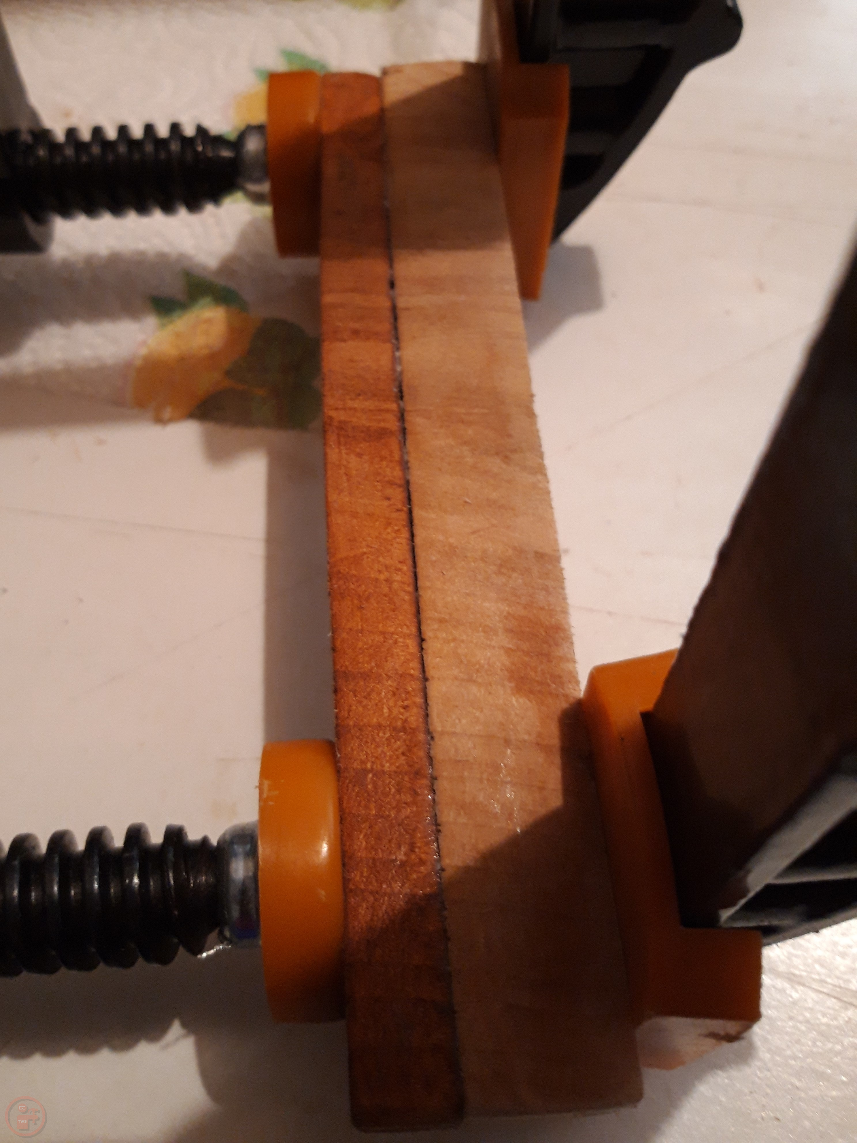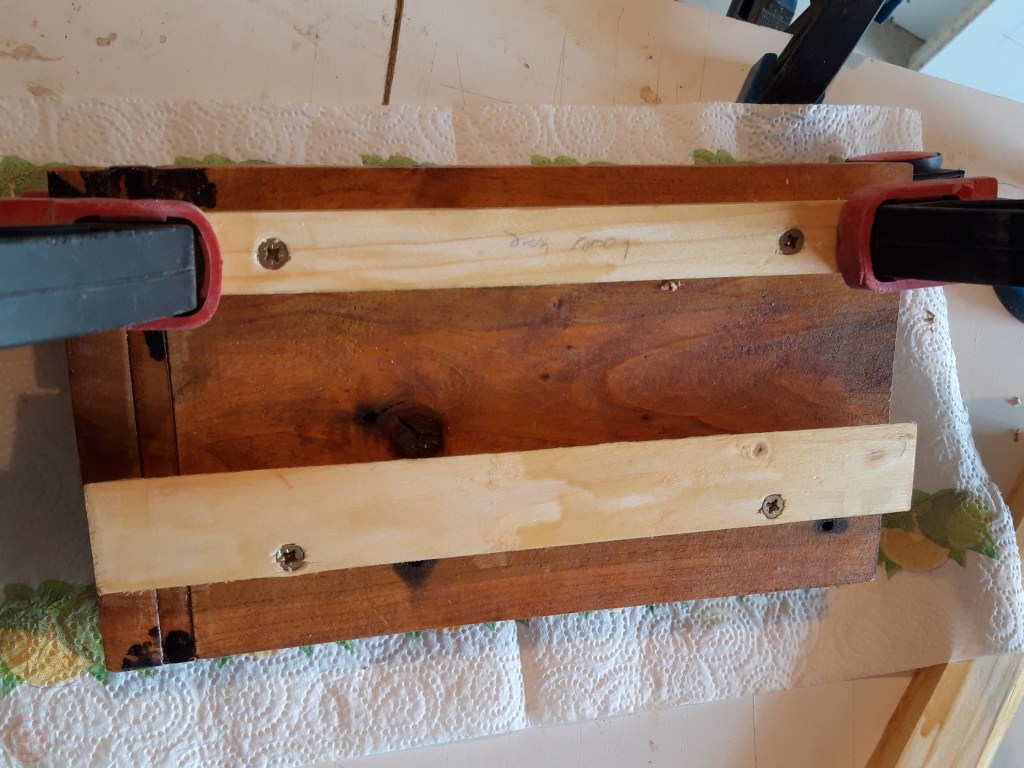I glued the cut off section back on, using wood glue and clamps to hold it in place while the glue dried. Once that was done, I gave the whole workpiece a thorough sanding, which removed some of the stain from the cut-off (and re-glued!) section. I then applied two coats of a waterproof varnish to the workpiece to protect it from the elements, giving it time to dry in between coats and a very light sanding with a high grit sandpaper.