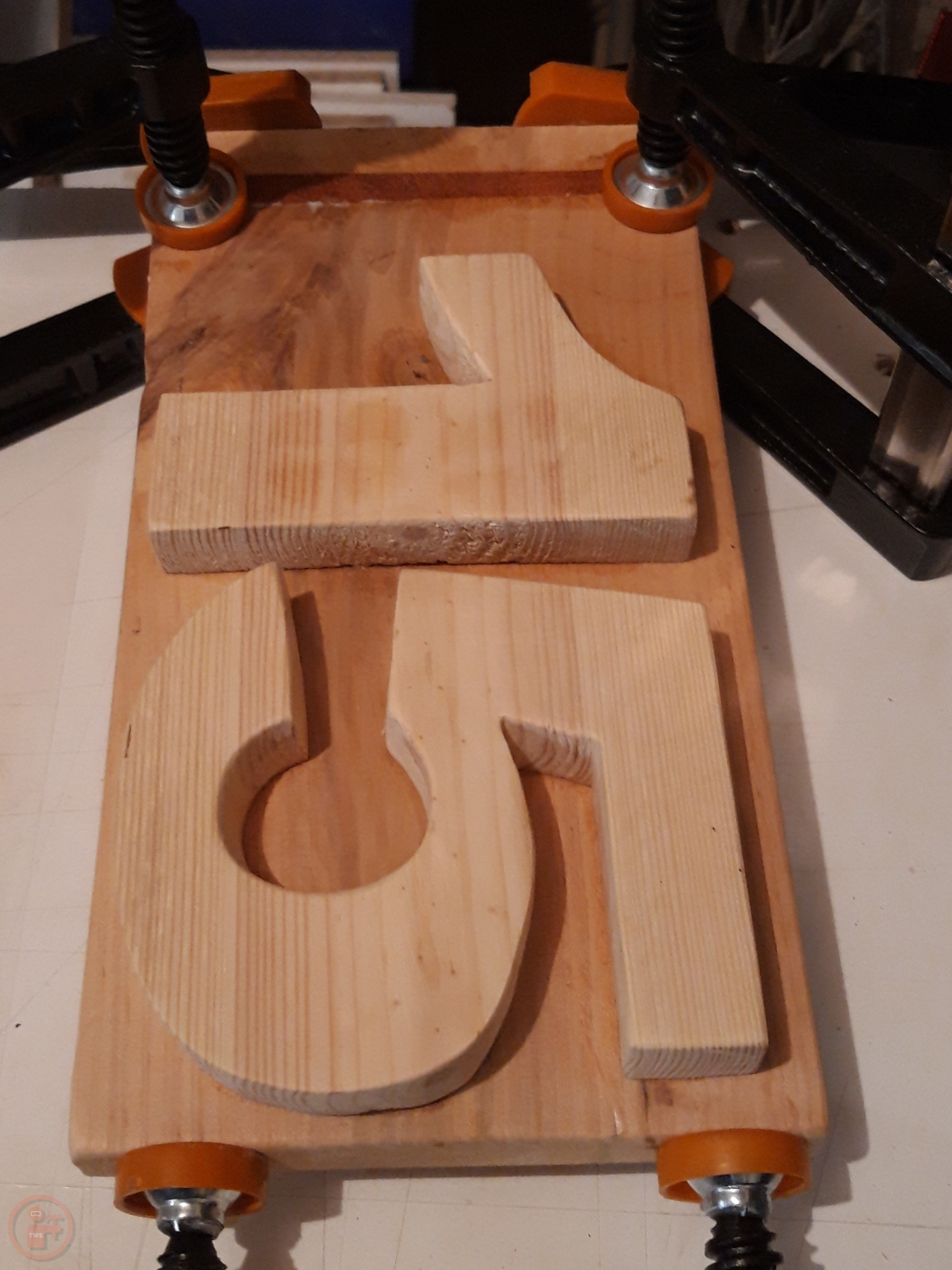 Once I was happy with the numbers, I mounted them to another flat piece of scrap pallet wood that I cut to size using the table saw. I used plenty of wood glue and clamped the numbers in place, leaving them overnight to allow the glue to fully cure before moving on to the next steps.