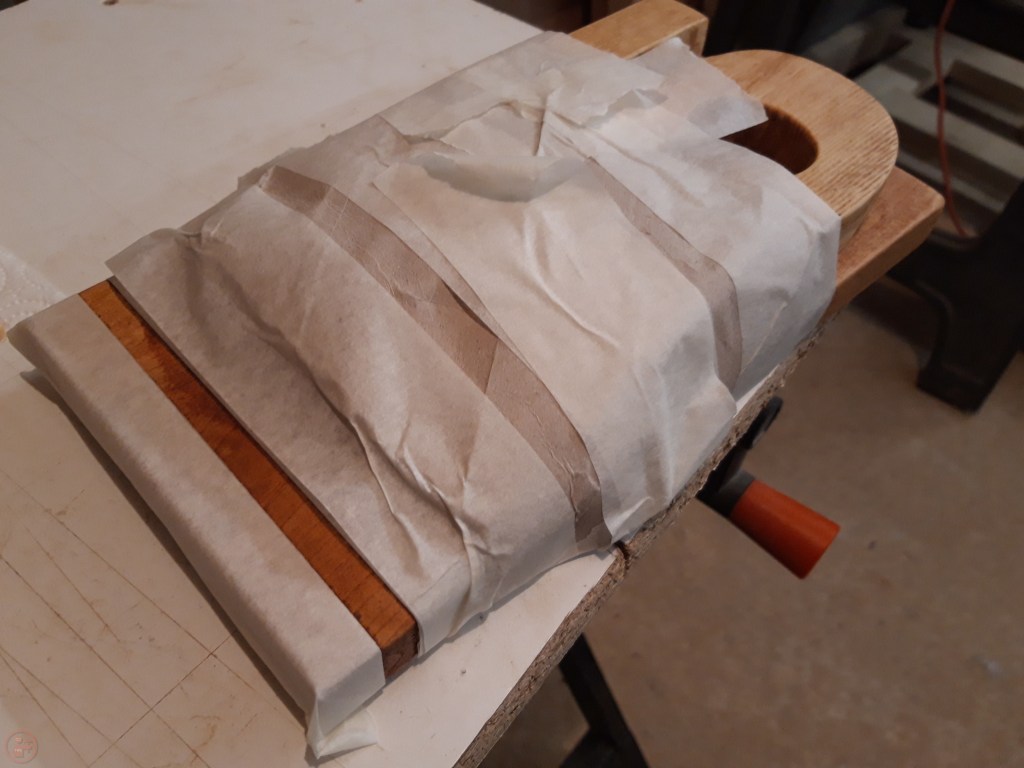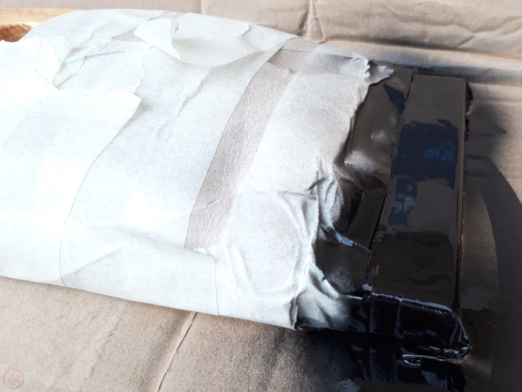 Once the varnish was fully dry, I masked off the majority of the workpiece, leaving only the highlight area clear. I used a black (satin finish) spray paint to cover the area, which due to the satin finish had a nice reflective sheen once dried, but not too bright like a full gloss would.