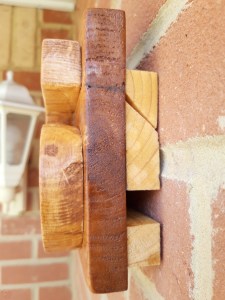 After varnishing the extra pieces, I mounted one half of the French cleat to the back of the number plaque using wood screws and then positioned the baton on the lower section of the plaque. I mounted the corresponding piece of French cleat to the brick wall outside using the existing screw holes and then simply slotted the number plaque down on top.