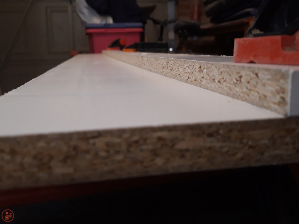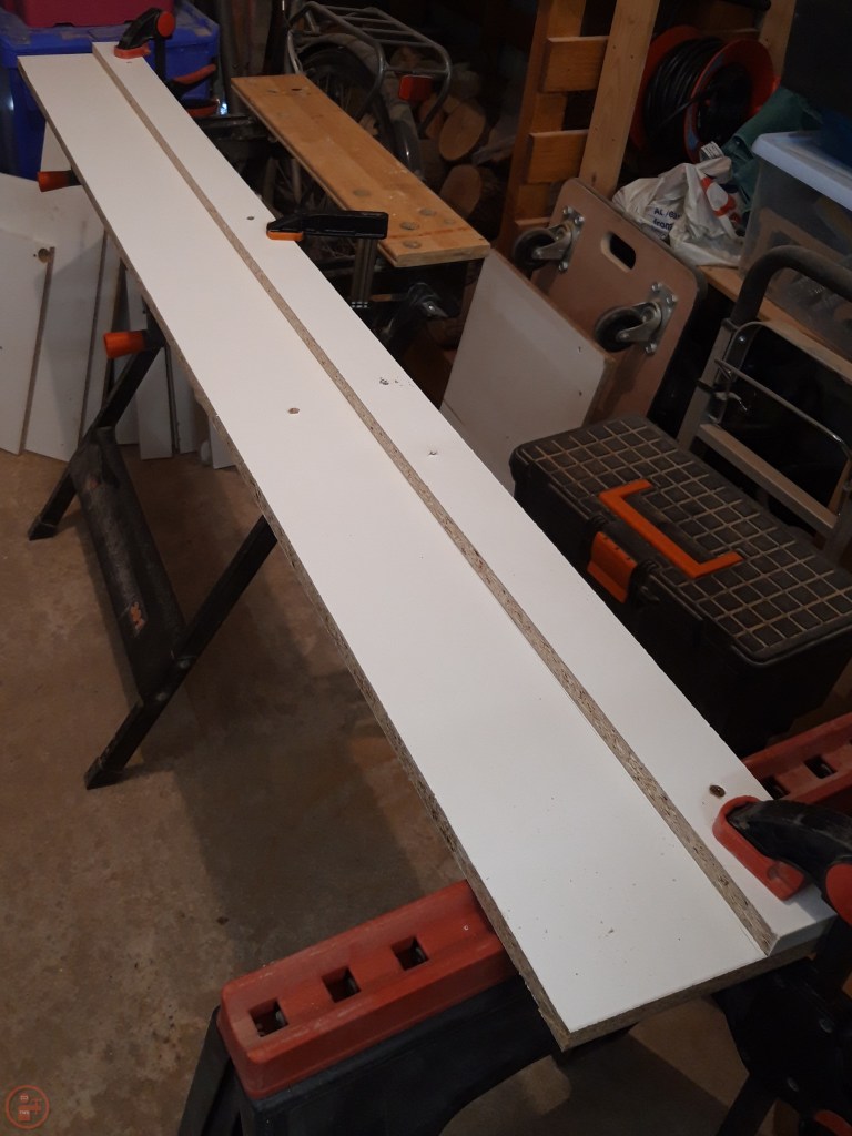 I had some white melamine coated chipboard left over from a dismantled wardrobe, so I used this to make my track. Firstly so it wouldn’t go to waste, as chipboard is fairly week and not great for long shelves or anything under much stress as it tends to flex. And secondly as the melamine provides a good low friction surface, allowing the saw to easily slide back and forth with a little bit of wax.