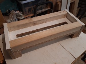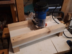 I needed a means to flatten a slab of log (see previous blog post) so decided to make a simply sled for my router. I grabbed some pallet wood and cut it to the right dimensions to raise the surface above the height of the log slab. I used some white melamine coated chipboard left over from an old wardobe for the surface as it allowed the router to slide really easily.
