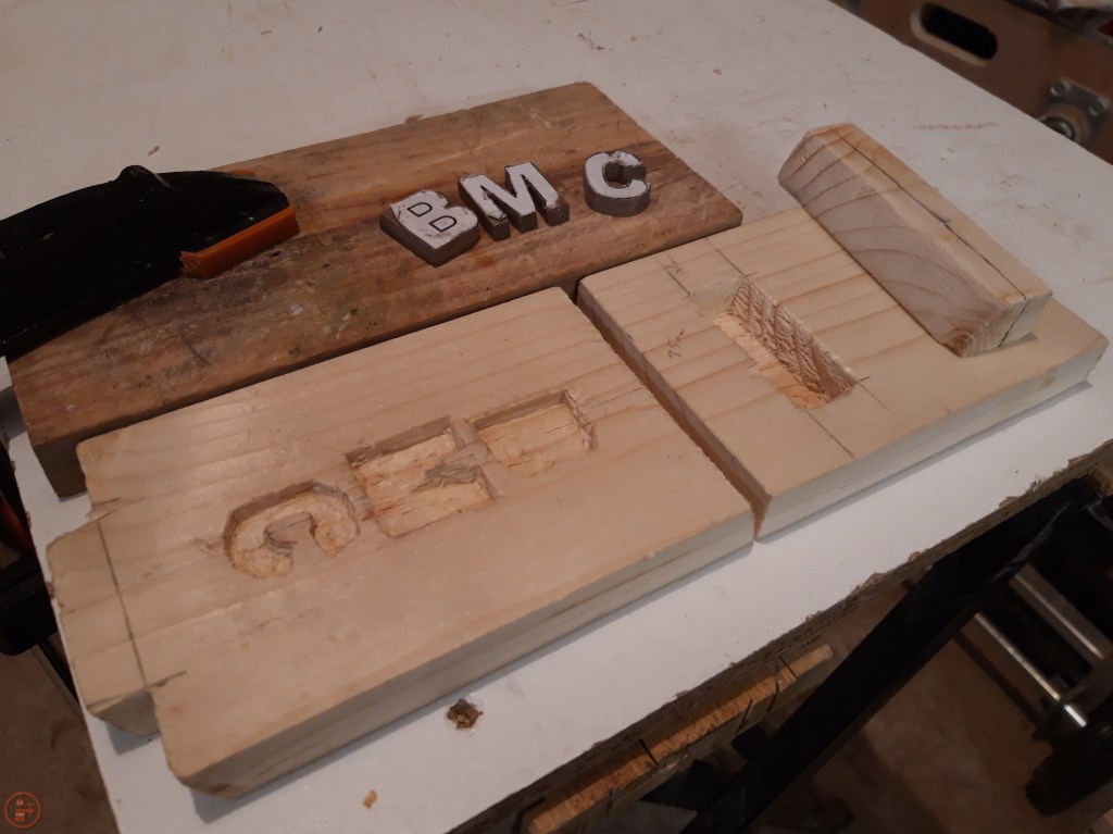 I printed out some letters for my brother’s initials and then used my coping saw to cut them out of a thin piece of walnut I had left over from a previous project. Once I had the letters sanded flush with the printed letter templates, I used the walnut letters to draw out the material to be removed from the pine piece, which I then did carefully using a chisel.