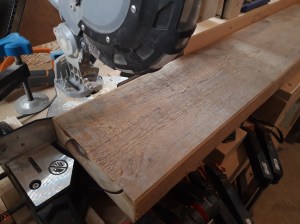 I started with a nice chunk of (unknown) wood from my lumber pile. I worked out dimensions from my sketched plan – I tend to design all my builds in a dedicated woodworking notebook – and then cut the wood to rough dimensions on my mitre saw.