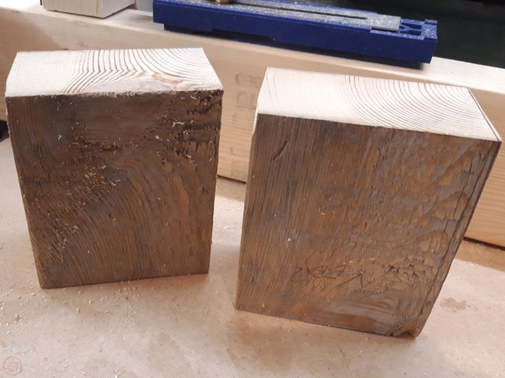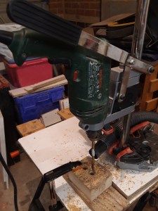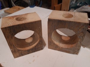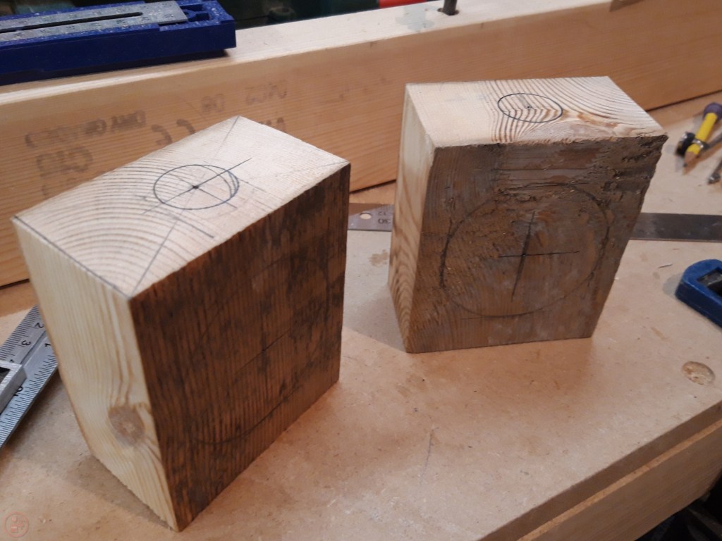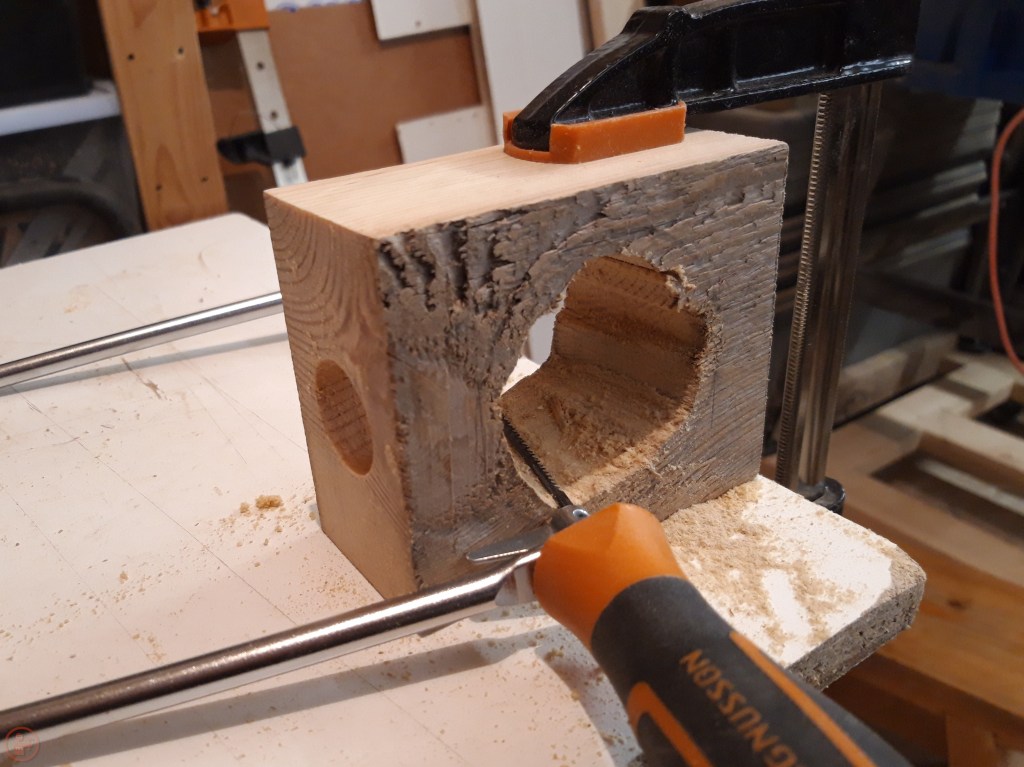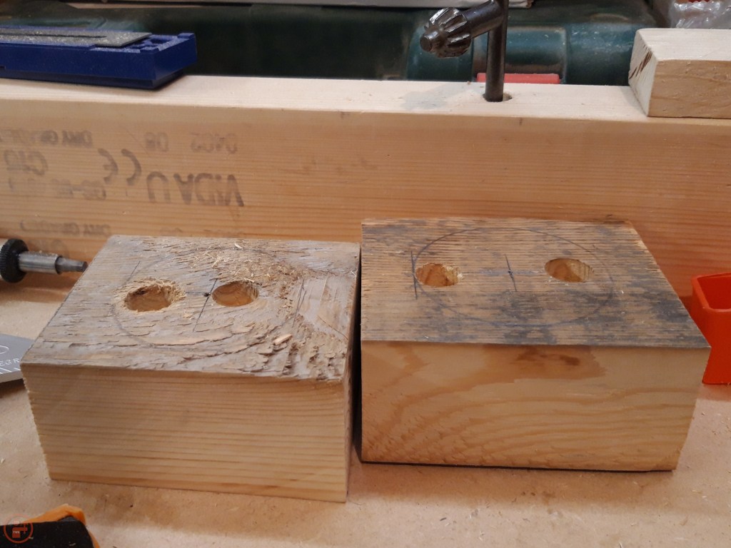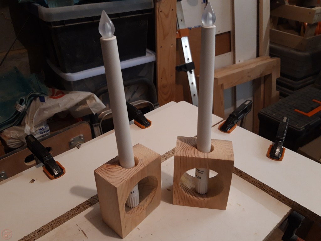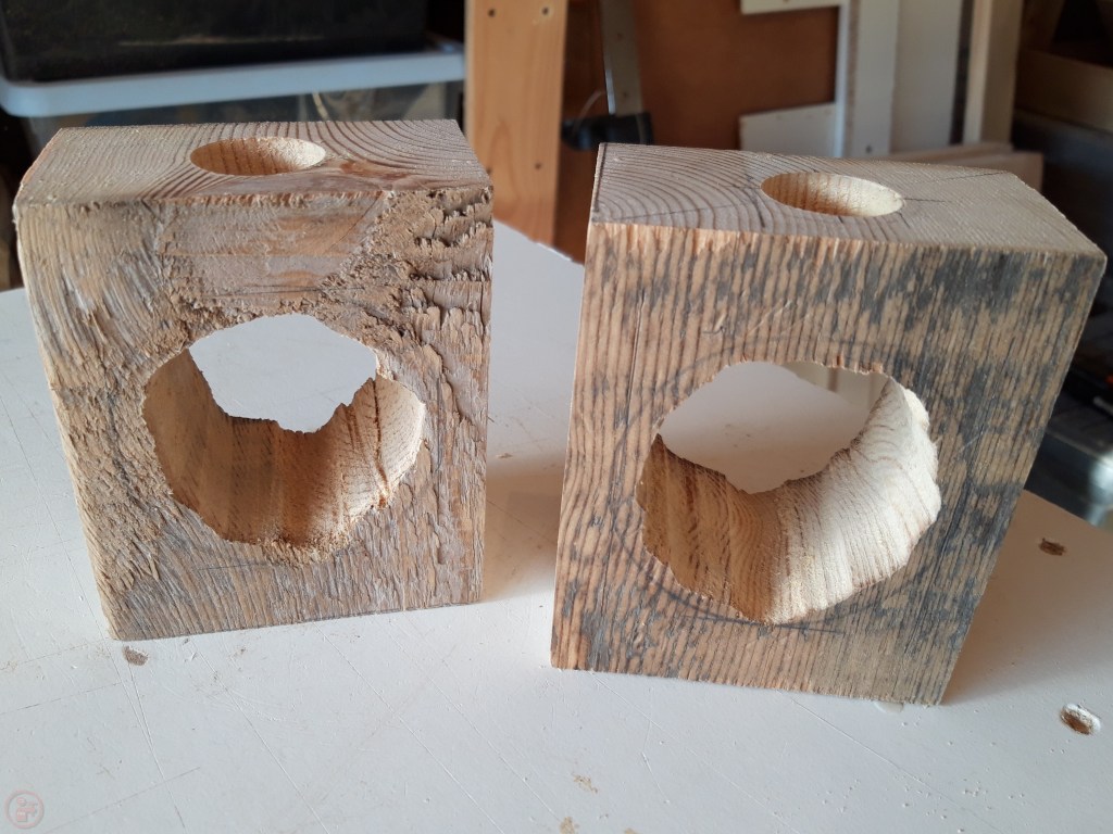I marked the side where I needed to cut out a large hole, and marked the top where I would drill the hole for the candle to slot in. Using the mitre saw made sure I had parallel faces on the top and bottom (and sides) so the workpiece sat flush and solidly on the workbench.