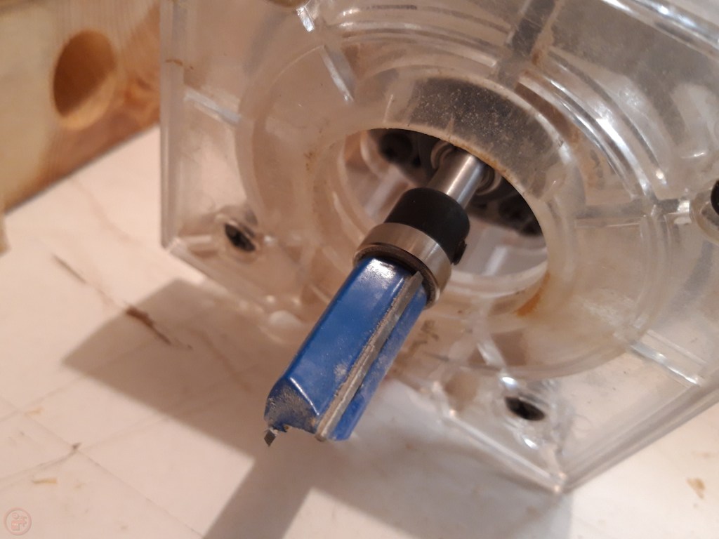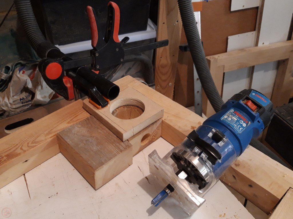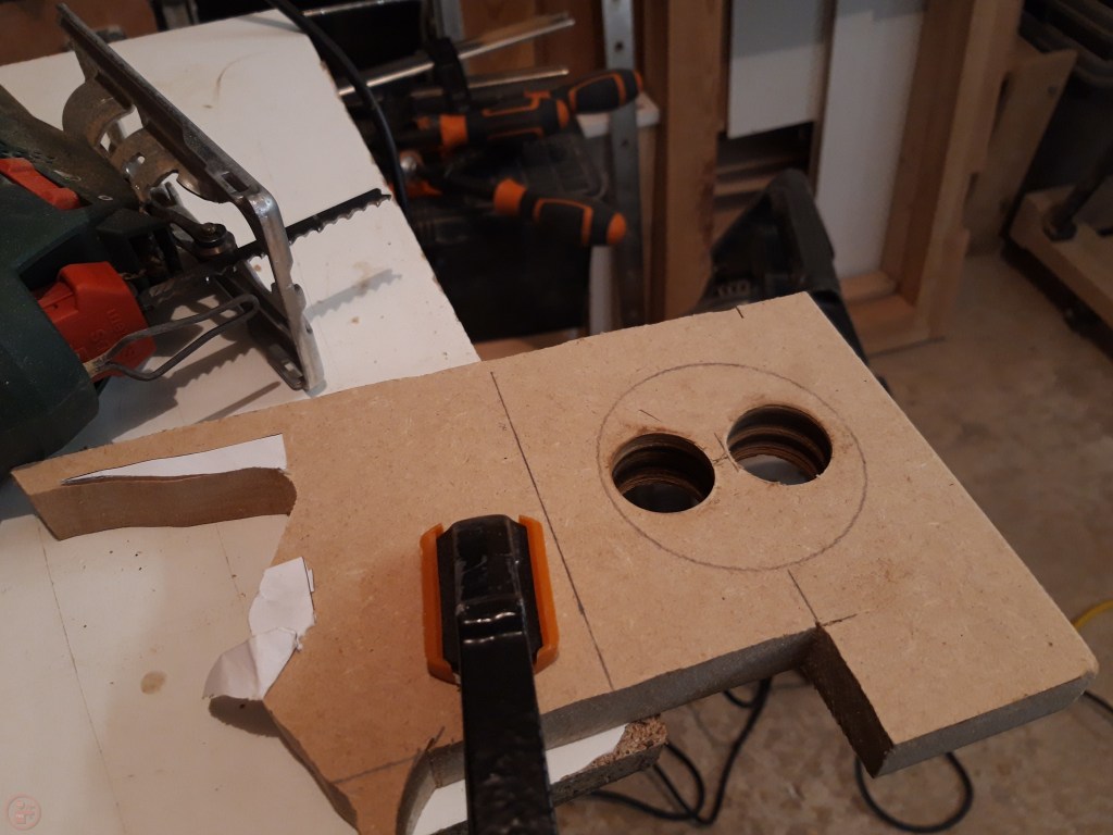 I refined the hole in the side using a coping saw to remove the bulk of the waste, getting close up to the marked line. I then used the mdf jig and a flush trim router bit in my palm router to follow the template. This left me with two workpieces with identically cut-out holes in the sides and the insertion holes in the top.
