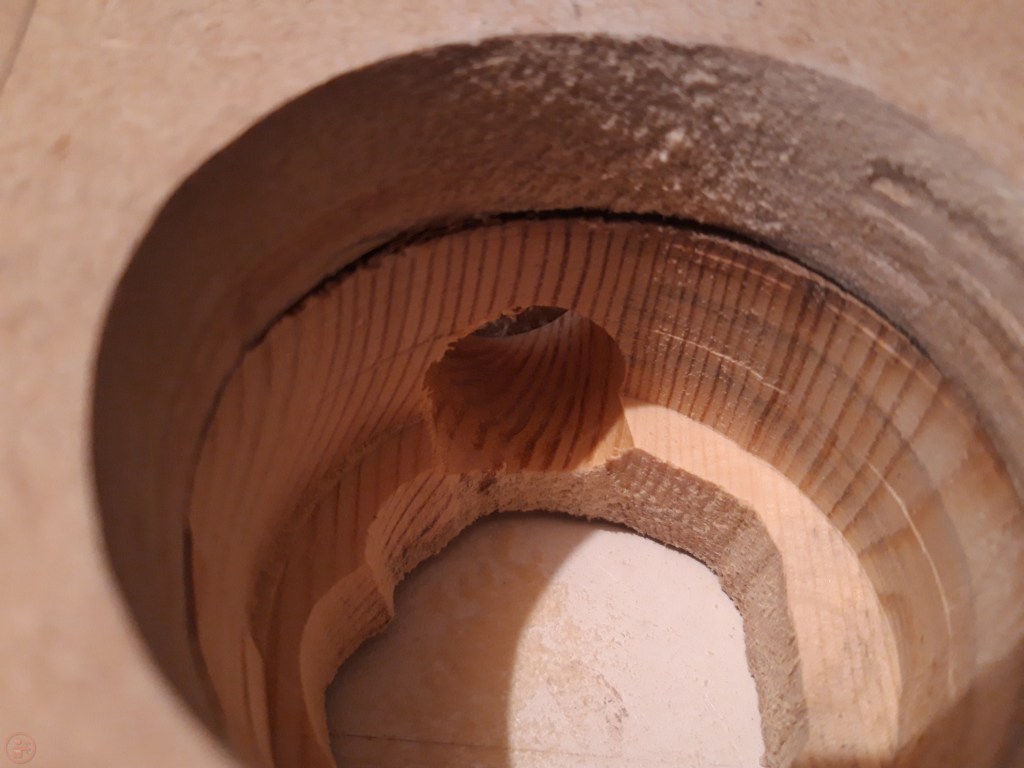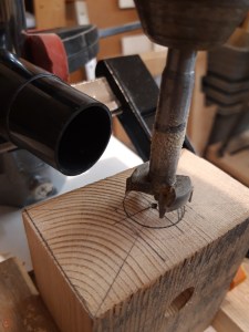 I used a forstner bit in the drill press to make a neat hole for the candle in the top, alternating pressing down and lifting the drill again to remove the waste and prevent the bit from getting stuck.