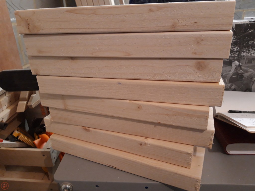 I ripped each 2×4 into 2×2 posts, resulting in four long and four short for each planter for the short and long horizontal stretchers on both the short and long sides.