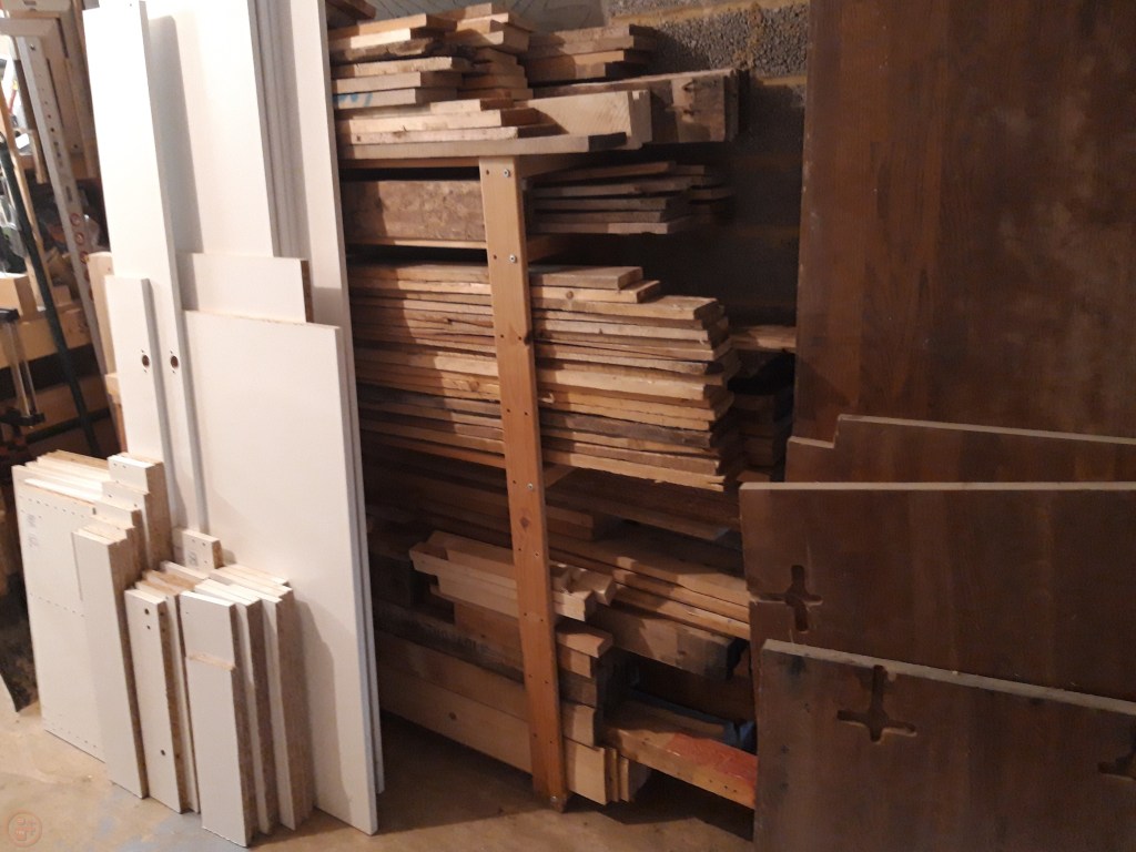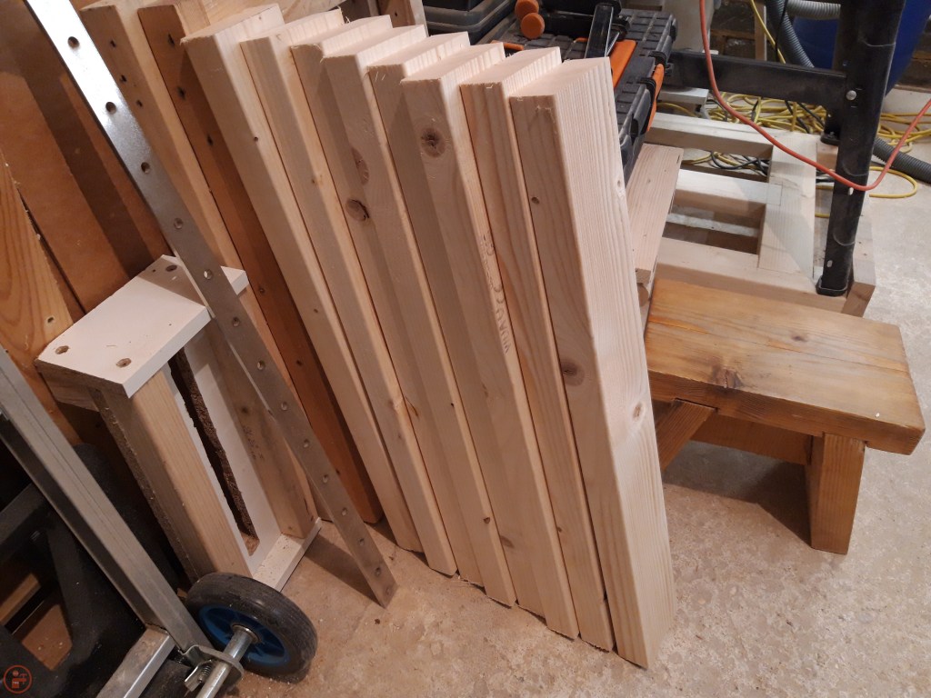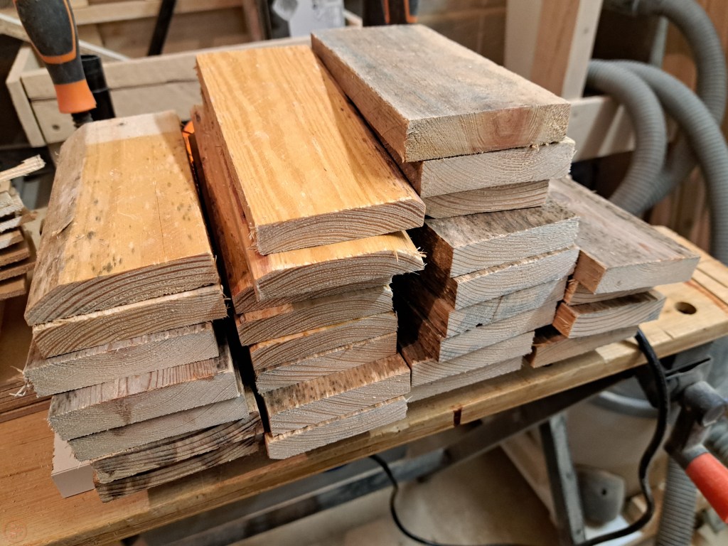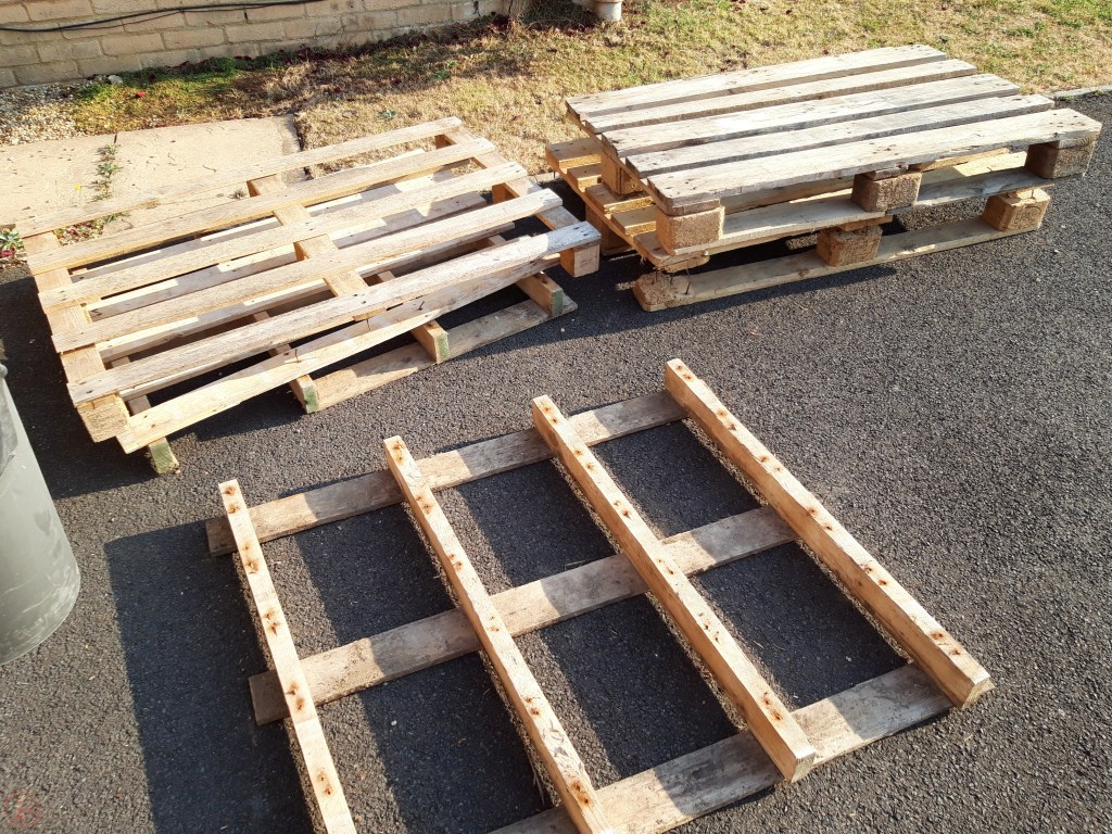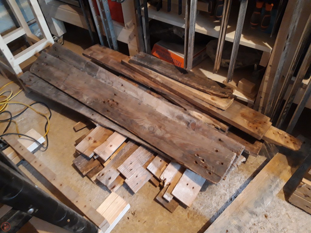 With the posts finished, I now had all the frame pieces completed and turned my attention to what I would use to fill in the base and side panels of the planters. I decided on using some pallet slats, as recycling existing material is always good, and as the planters are going to be painted anyway, the wood does not need to be of a high quality. I used my various tools, including my Pallet Buster, to disassemble a number of pallets and salvaged as much of the wood as possible, which I added to my lumber shelving.