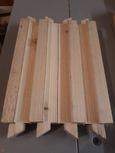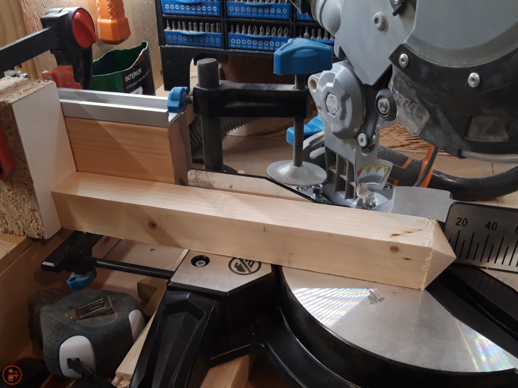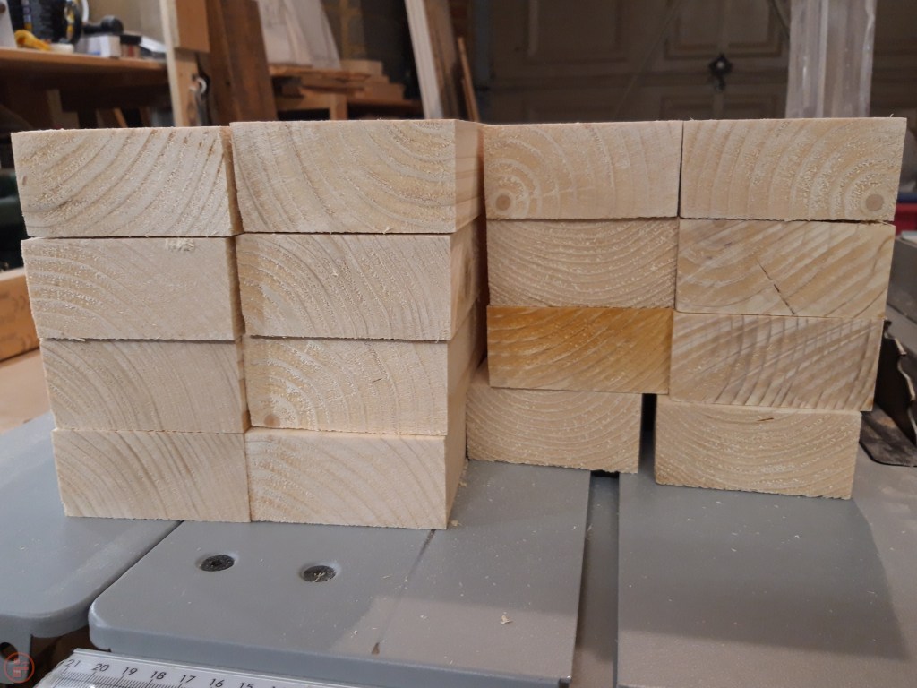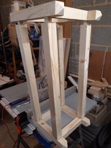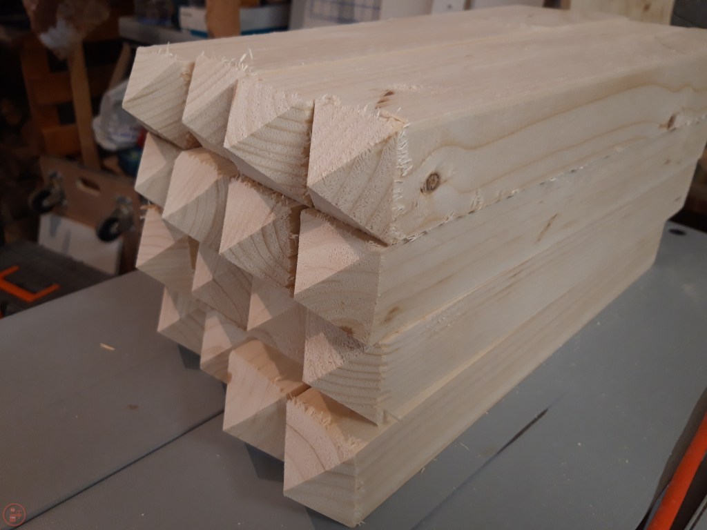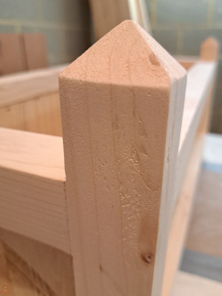 I also cut more posts for the legs – I wanted these to be more interesting than just a flat top, plus an angled top allows the rain to fall off and not be drawn into the end grain. I used my mitre saw at a 45 degree angle to cut a section off the top of the post on all four sides of each piece. This resulted in a square-based pyramid with nicely sloped sides at the top of each post. As each post required four cuts, and each planter had four posts (16 cuts) AND I had four planters to do (64 cuts total!), this took me quite a while and generated a huge amount of sawdust!