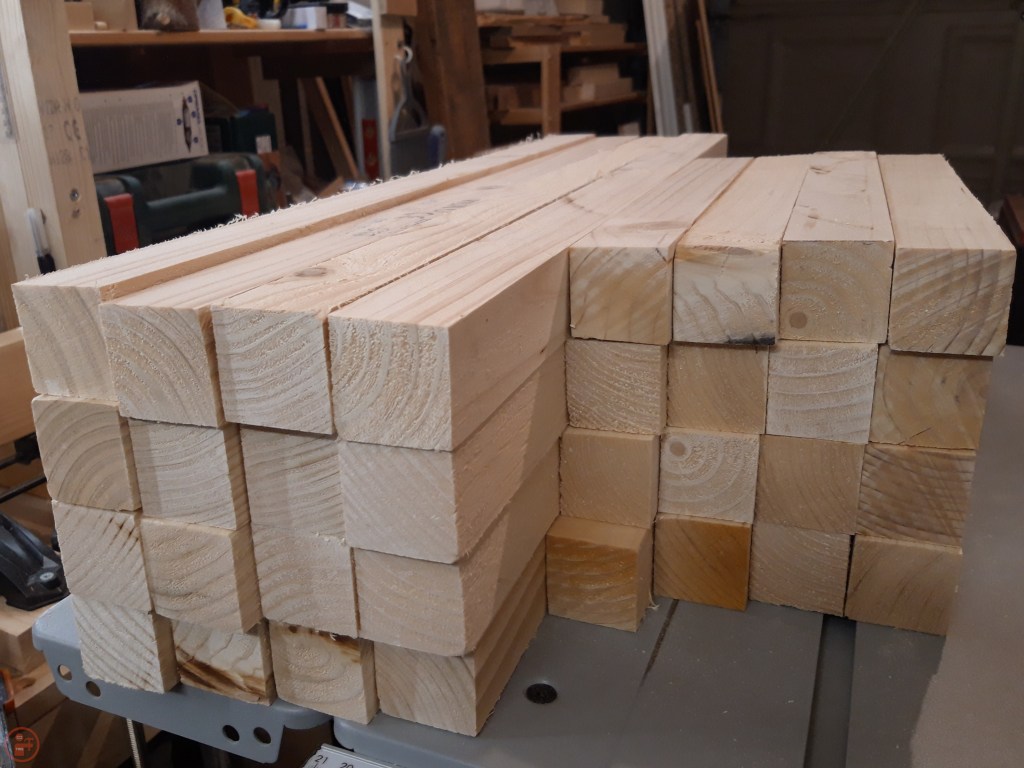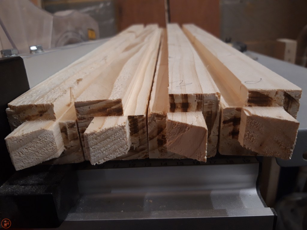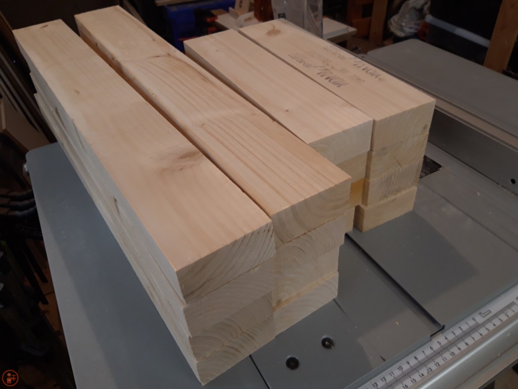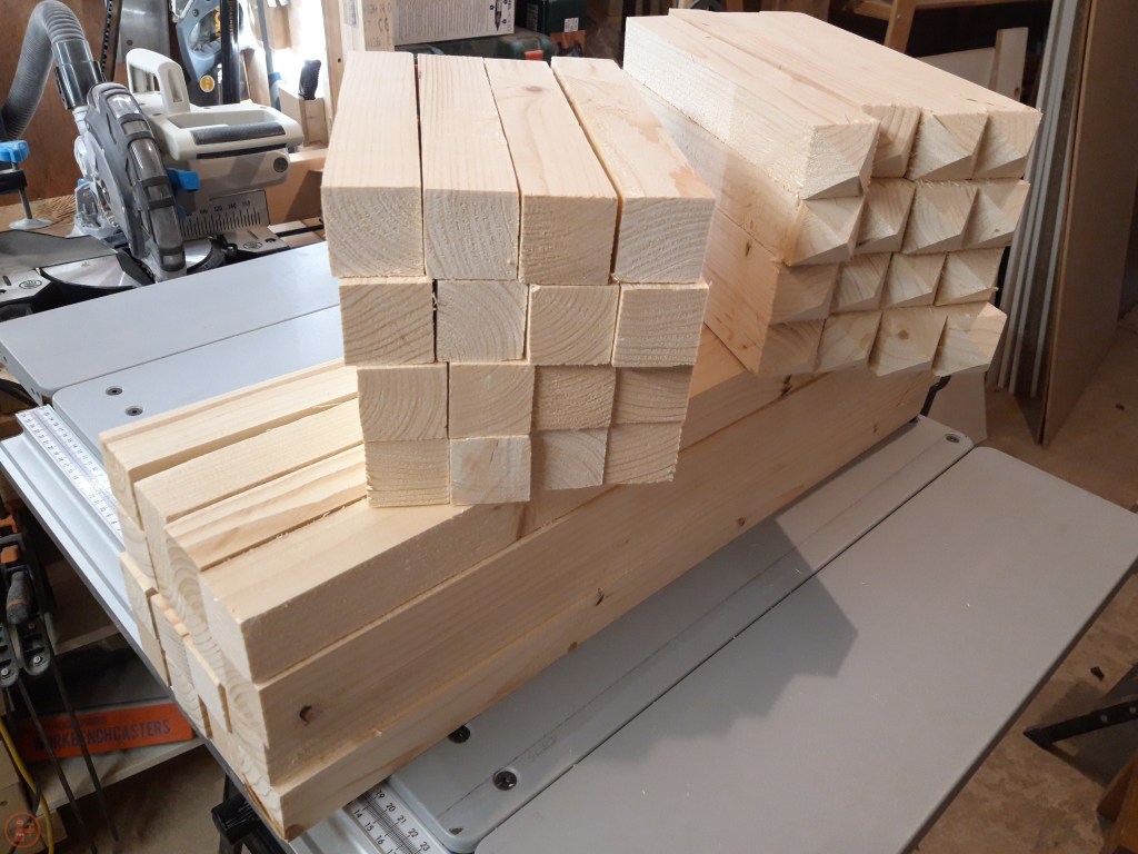 I measured the pieces I needed and cut them to length on the mitre saw. As 2x4s have a rounded edge, I then ran them through the table saw to leave me with perfect square lumber to use to make the frames. Although I was doing the assembly of the first planter initially as the prototype, I batch cut all the pieces for all four, to save time in the long run.