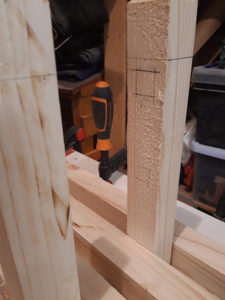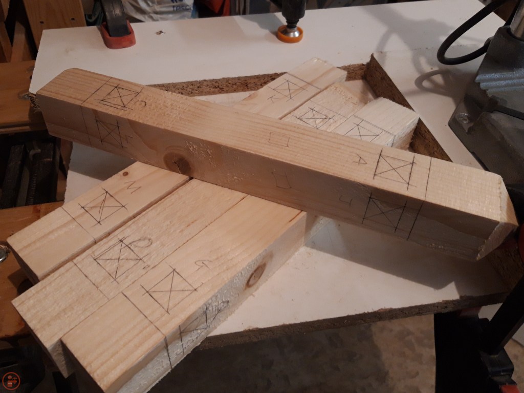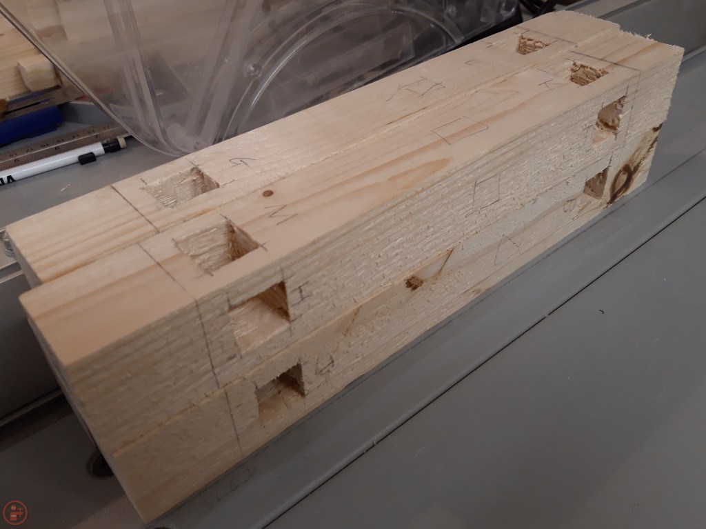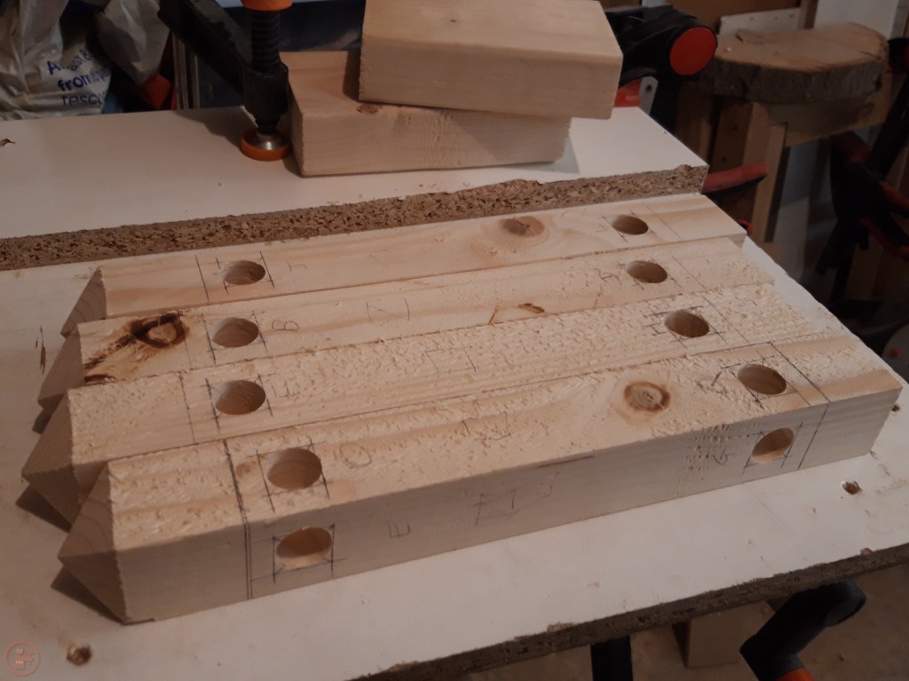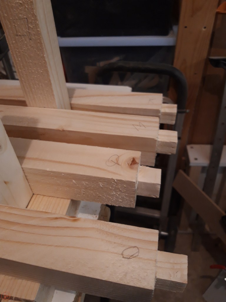 With all the tenons prepared, I used them to mark out the mortice sizes required on the posts. As each tenon varied a little bit, I labelled every mortice and tenon with a corresponding letter so I could ensure I was exactly matching the size accordingly.
