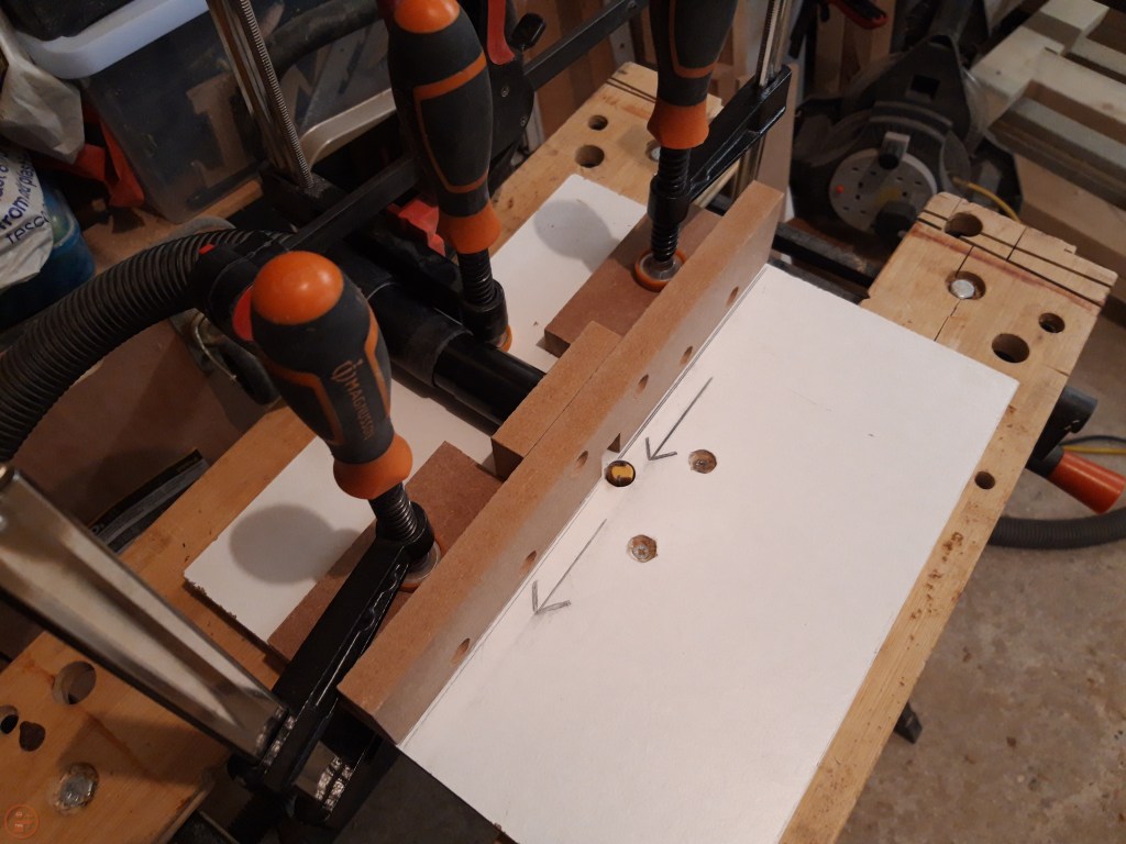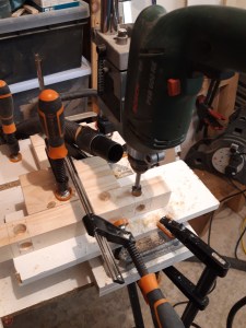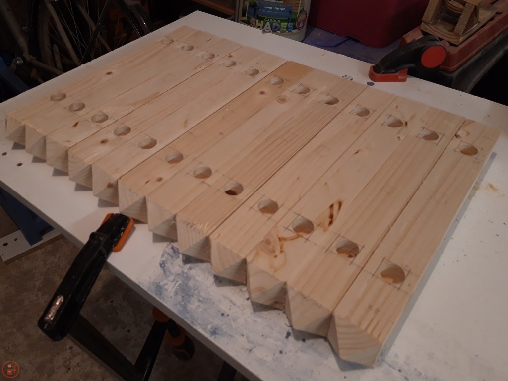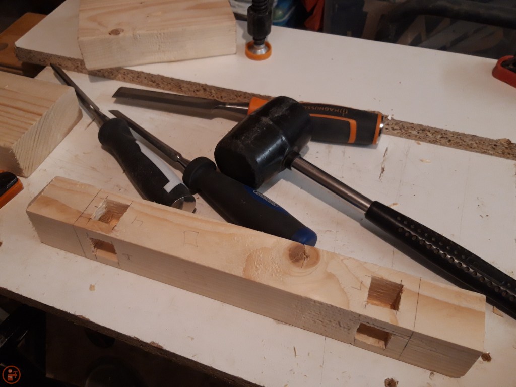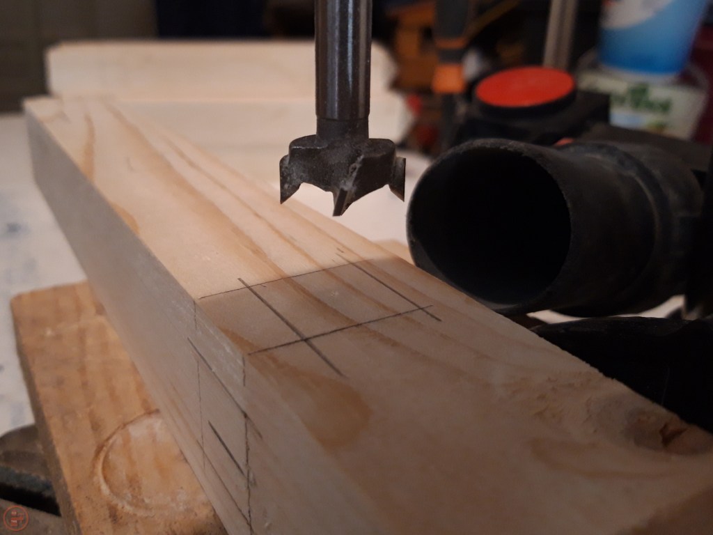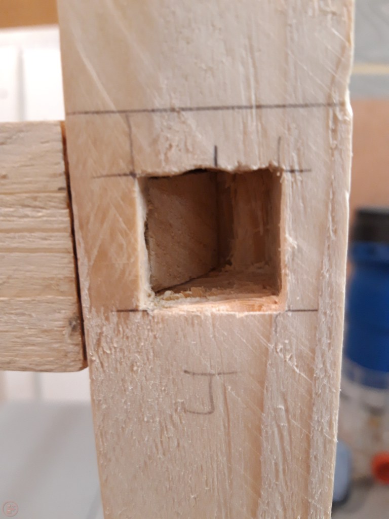 I used my drill press stand to remove the bulk of the waste from each mortice using a Forstner bit slightly smaller than the width of the required mortice. This was much quicker than chiselling every single mortice out fully by hand and ensured I achieved a consistent depth in each mortice through the application of the depth stop. This meant I didn’t remove more material than was needed, which may have weakened the joint by removing surface area for glue unnecessarily.
