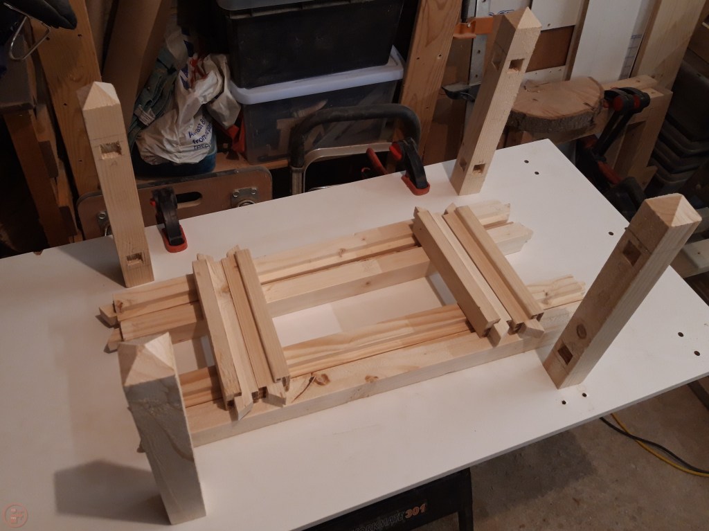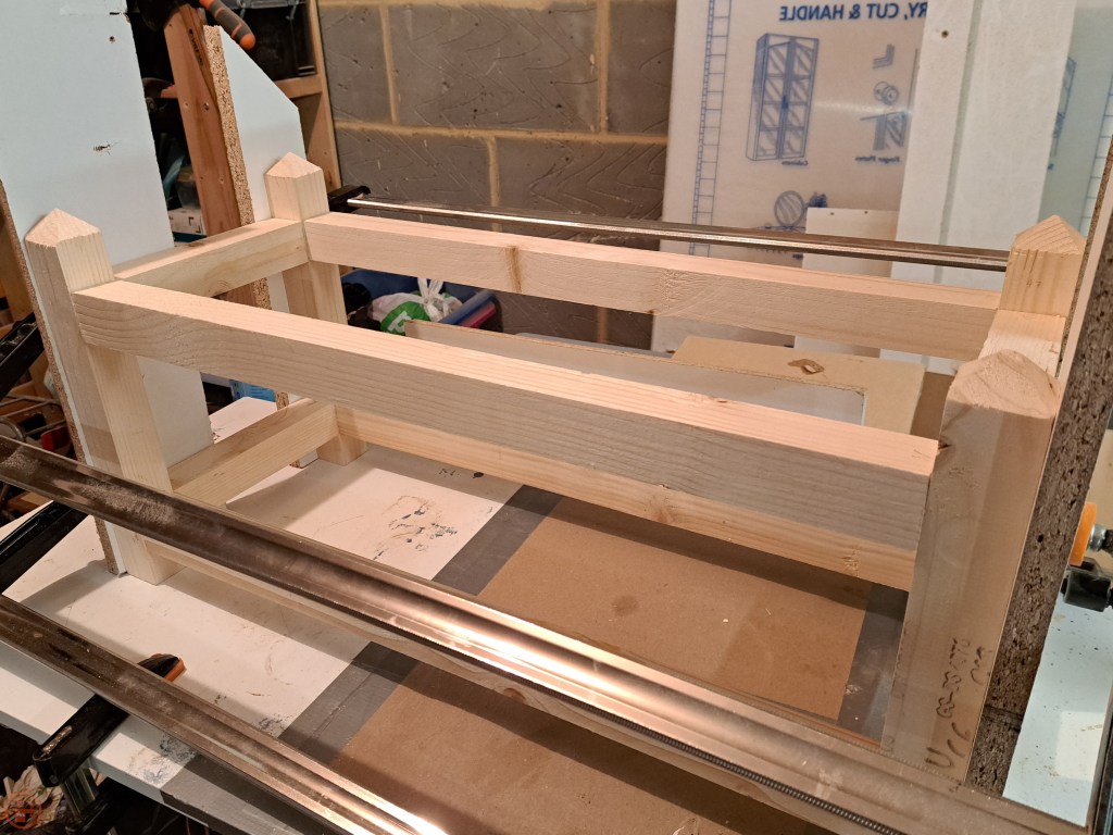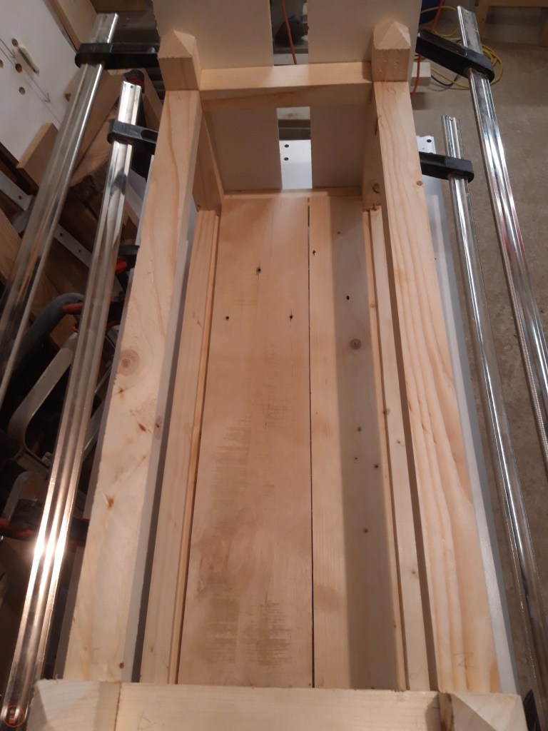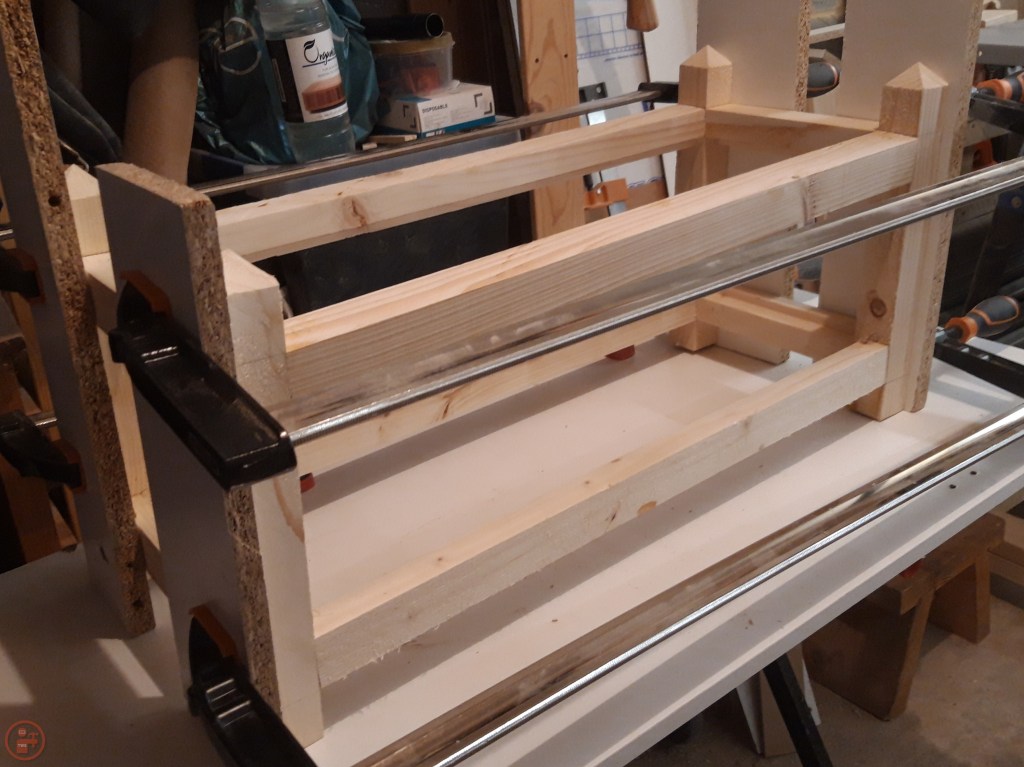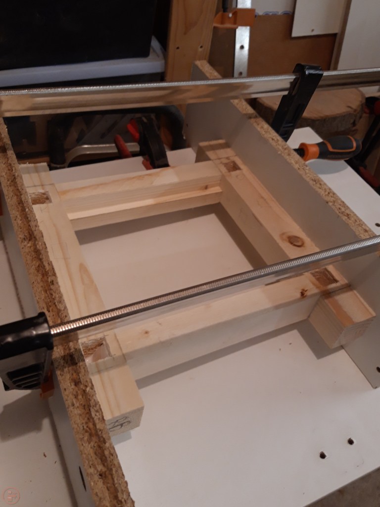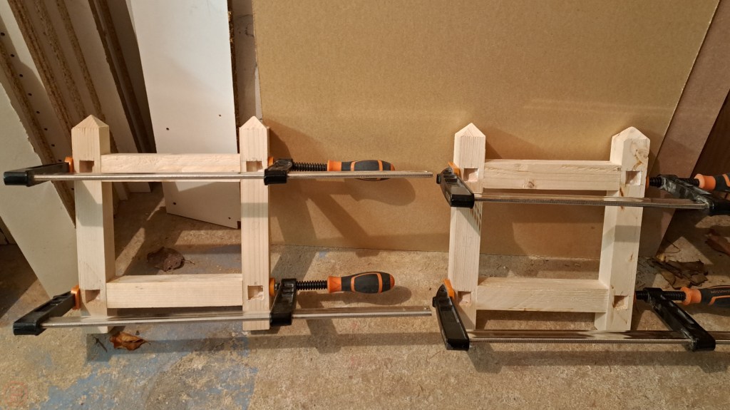 Once the end frame was dry, I repeated the process with the long stretchers, using longer clamps to secure the workpiece and provide even pressure through each joint. Glue ups can often be quite nerve racking, but as I made sure I had all the scrap material and clamps I needed before I started applying glue, this surprisingly went rather well!