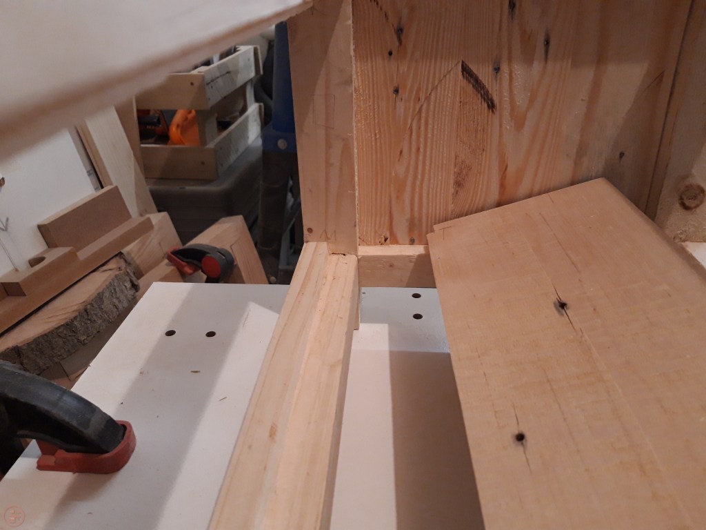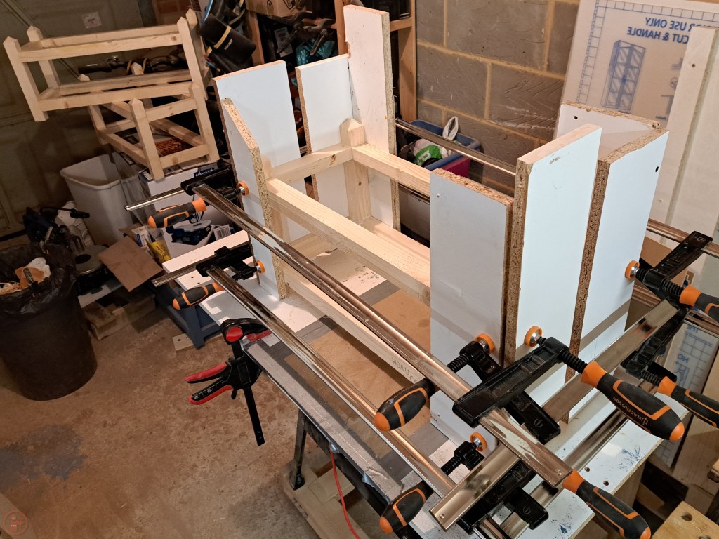 A final test dry fit and it was ready for final assembly! I used a large sheet of white melamine coated chipboard on top of my saw horses to give me a stable surface for gluing.