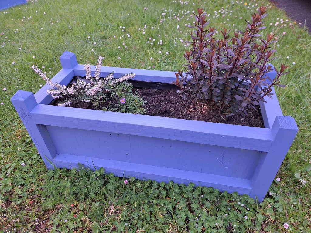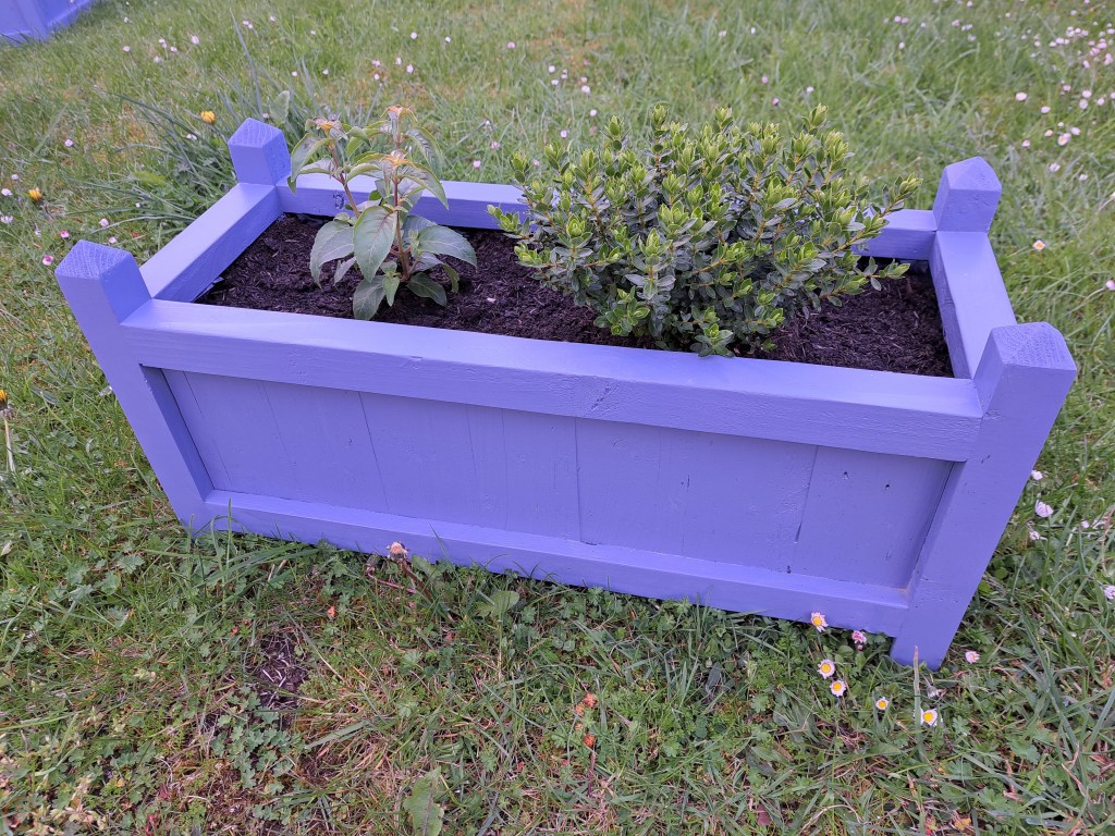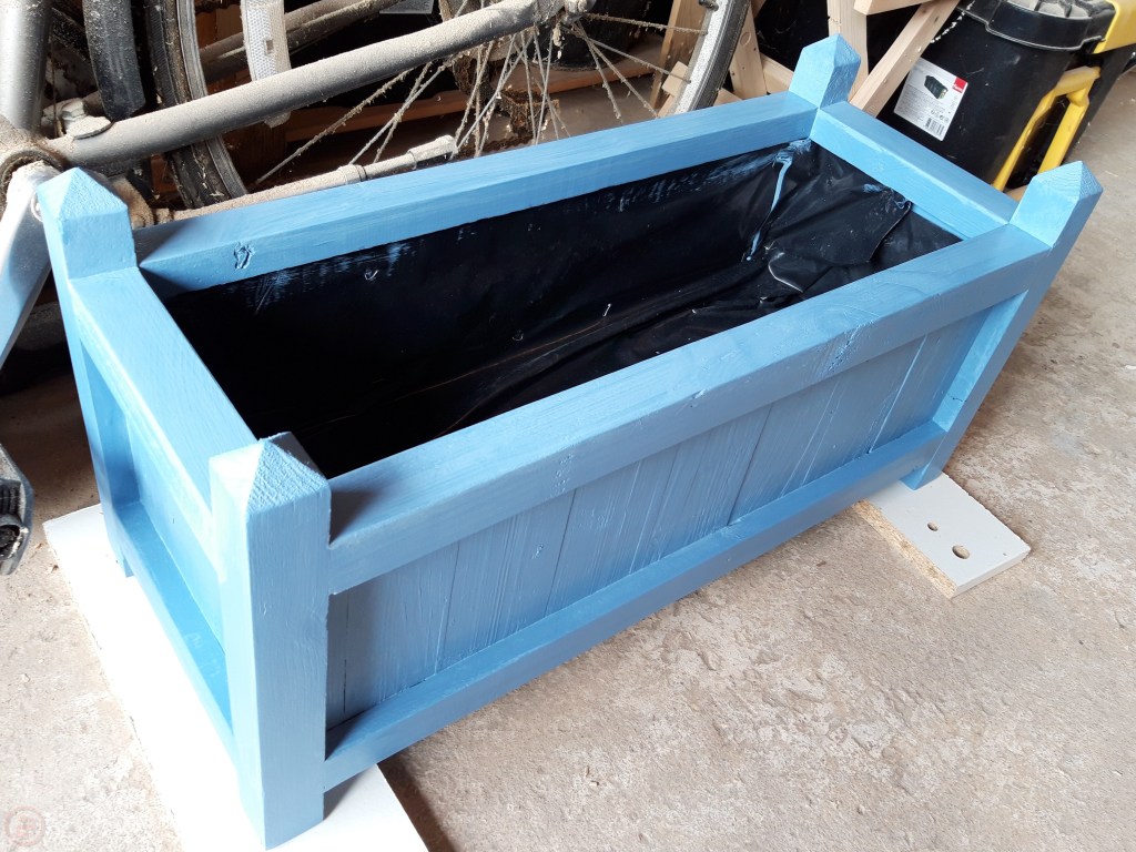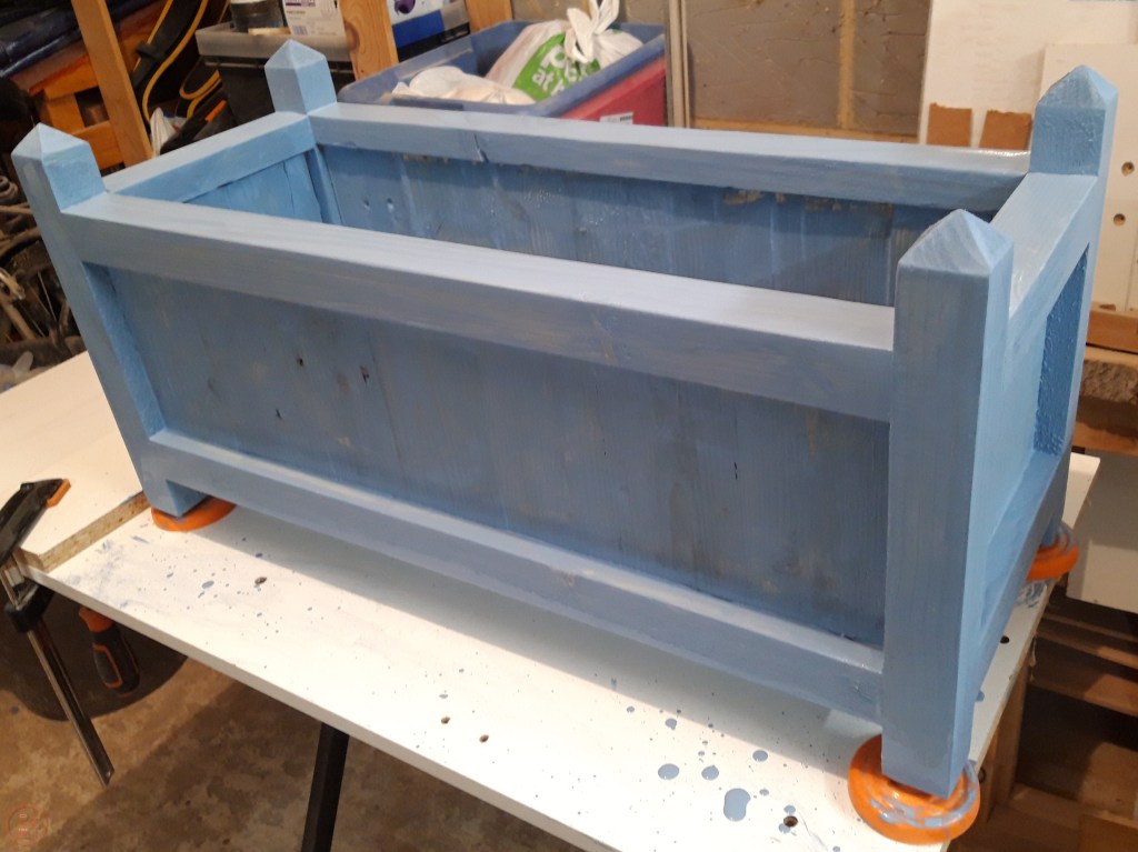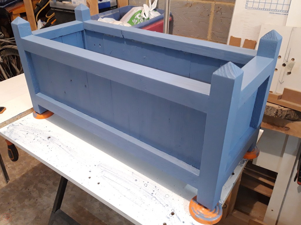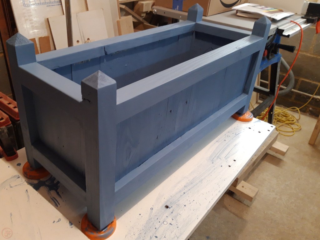I did a trip to our local big hardware store at this point to assess our colour options for outdoor paint – we settled on a Forget-Me-Not blue paint specifically designed for wood in the garden. Amusingly the tin has a picture of a very similar garden planter to my design on it!
