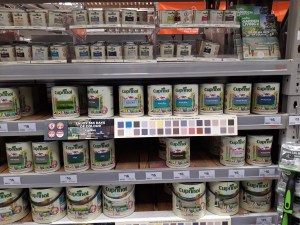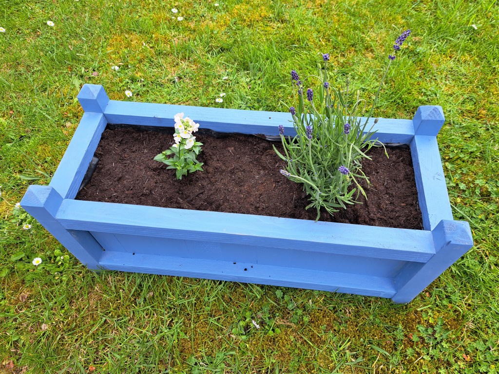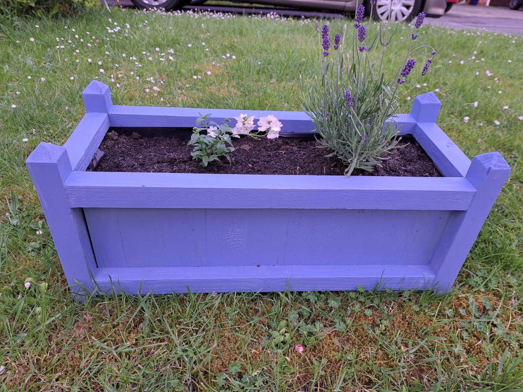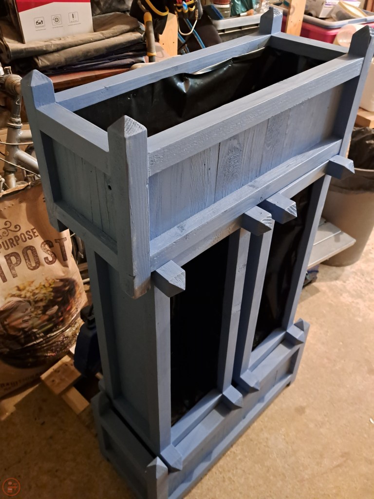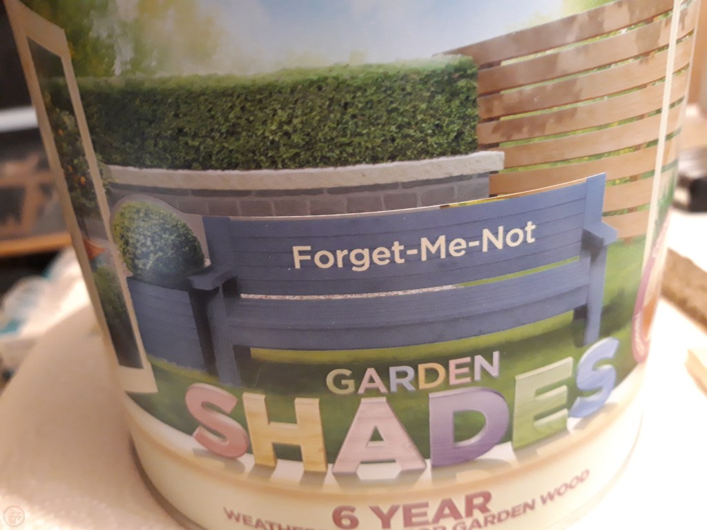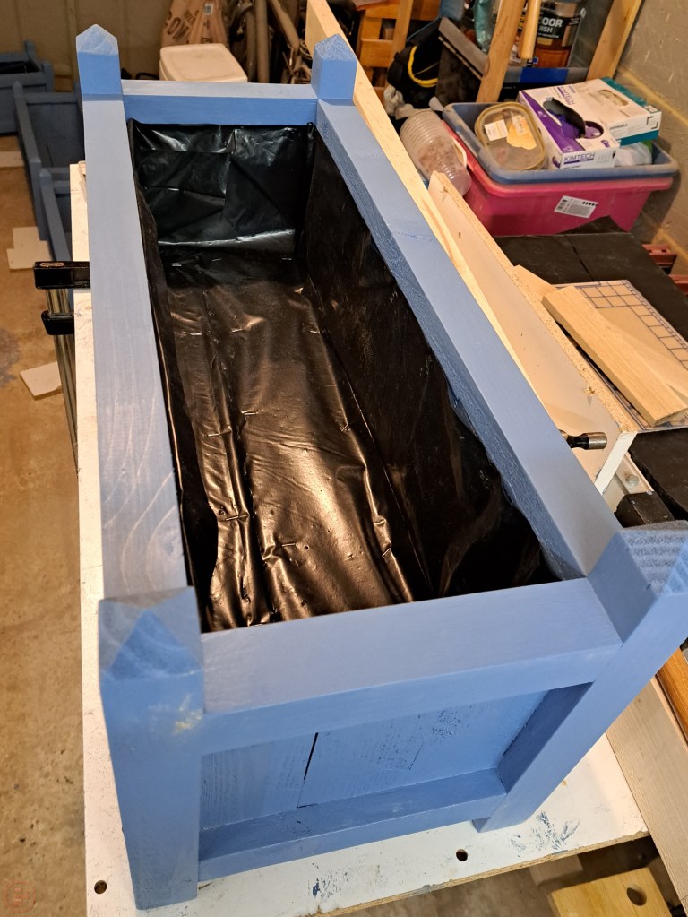 I did a trip to our local big hardware store at this point to assess our colour options for outdoor paint – we settled on a Forget-Me-Not blue paint specifically designed for wood in the garden. Amusingly the tin has a picture of a very similar garden planter to my design on it!