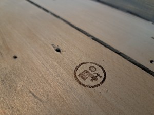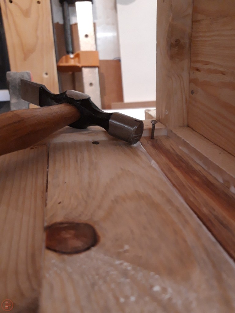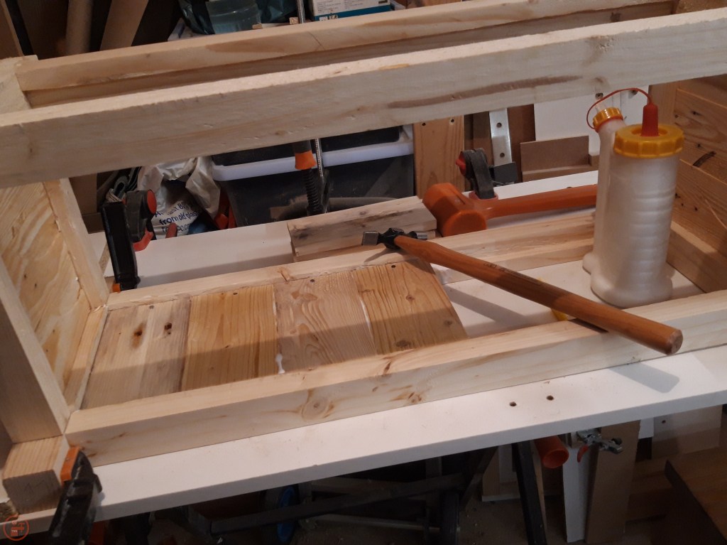 With the paint purchased and a few power tools inspected (and not bought!), I returned to the workshop to continue adding the pallet wood side panels. I worked my way along each side, gluing and nailing each board into place. I used my hand plane to get a snug fit for the final piece on each side. Once each of the sides were complete, I slotted the base slats into place and used some logs from our log store to weigh the base down while the glue dried.