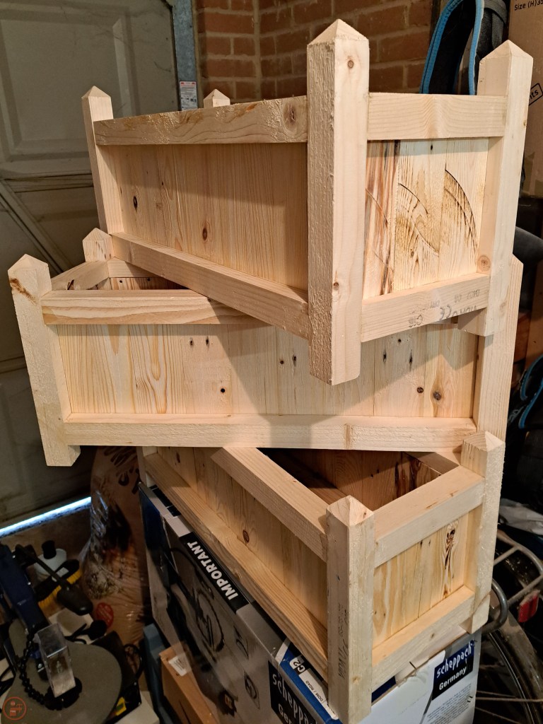 I am really pleased with how these have turned out – it was a lot of repeated cuts and keeping all the pieces organised and working out which posts matched with which stretchers was a bit of a logic puzzle! These should last us a nice long time with additional periodic coats of paint and occasional weeding to keep the plants healthy! 🔨