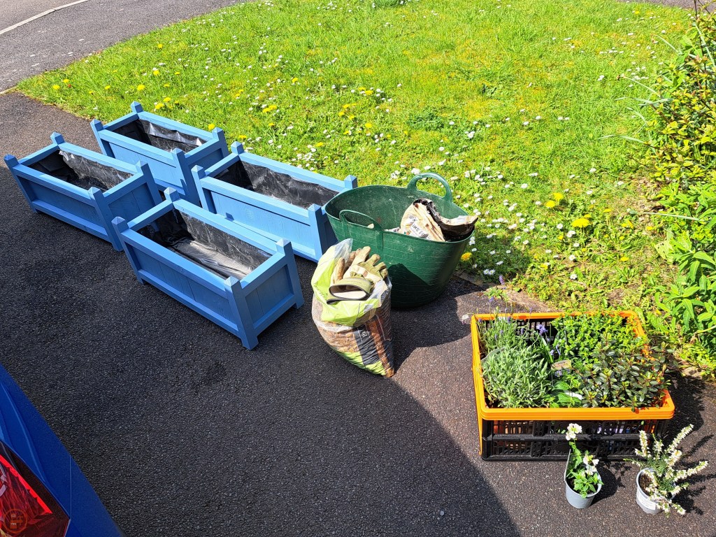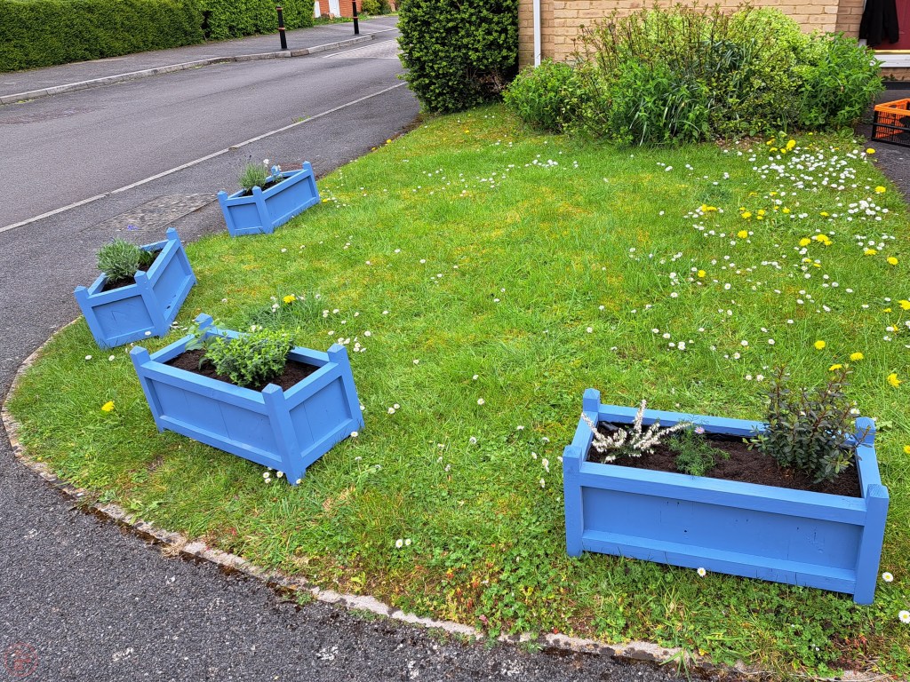 One of the challenges of living in a rented house, is the requirement for a lack of permanence in anything we wish to do to the garden to make it feel more homely and a nicer place to enjoy. Our front garden had only a few bushes under the front window and a boring area of lawn, which was often used as a cut through due to use living on the corner of the road. A solution for a physical barrier and for something decorative was some movable garden planters!