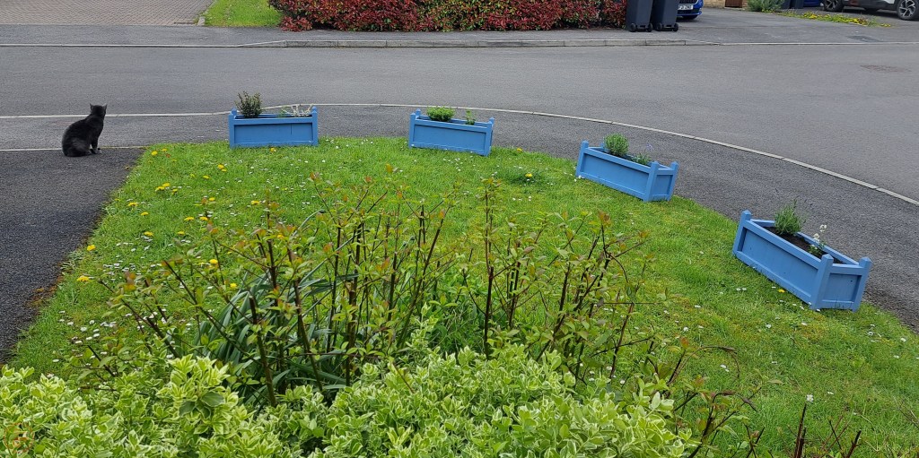 We added a good amount of compost and bedded the plants in well, adding more compost on top as it will compress over time with the rain (plus cat for scale!).