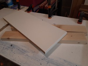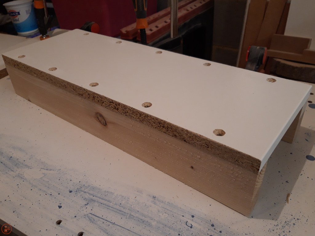 Once I had ripped and cut those pieces to size, I cut down a piece of white melamine coated chipboard (an offcut from an old wardrobe) and then positioned that on top of the pallet pieces.