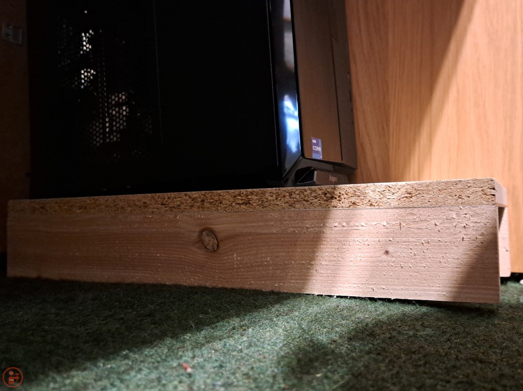My computer tower sits under my desk. To prevent it overheating, I wanted to make sure it had plenty of air flow around it and wasn’t sitting directly on carpet. I decided to make a simple platform to lift it up off the floor, which also makes it easier for plugging in wires and accessing the power button without having to bend down so far.