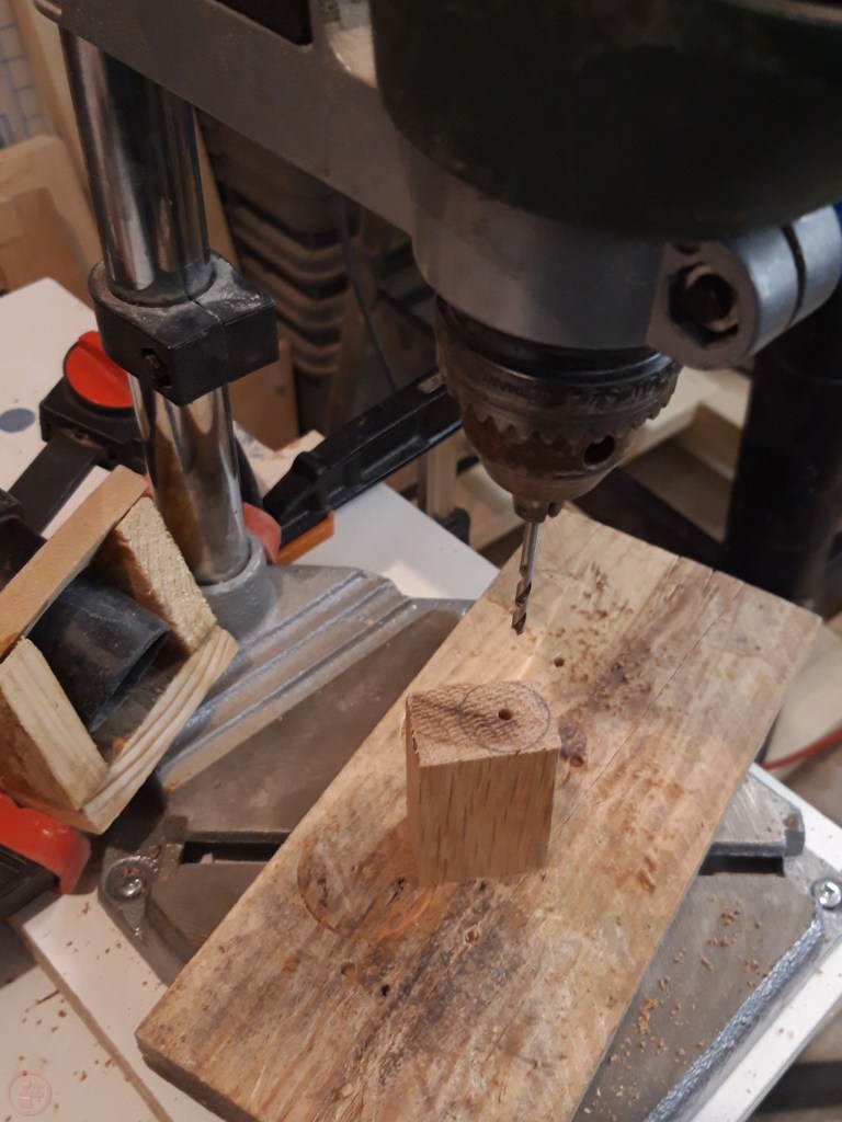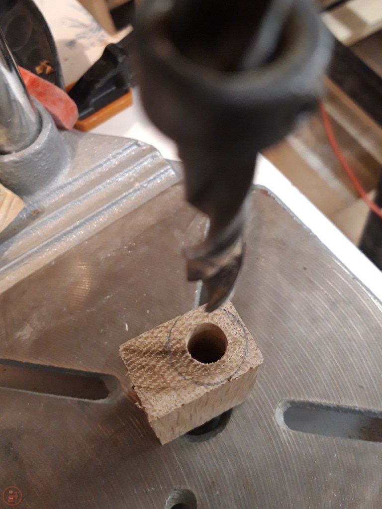 With the workpiece still as a solid block, I decided it was easier to drill the required holes now, as I could hold and clamp it more easily. I used a large 10mm drill bit to drill a hole about halfway through the workpiece. I then switched to a smaller 4mm drill bit and drilled a hole from the other end, through which the string will be fed. The larger hole allows for the string to be knotted and hidden within the light pull.