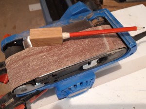 As the workpiece was now quite small, and I value my fingers (!), I applied some tape to the end of a pencil and then wedged that into the hole in the light pull. I used my belt sander clamped upside down with a 40 grit belt to carefully shape the light pull. I did the shaping in stages, gradually reducing the block into a rounded over block, then turning each corner into less of a sharp angle, until I was left with a round smooth cylinder-type shape.