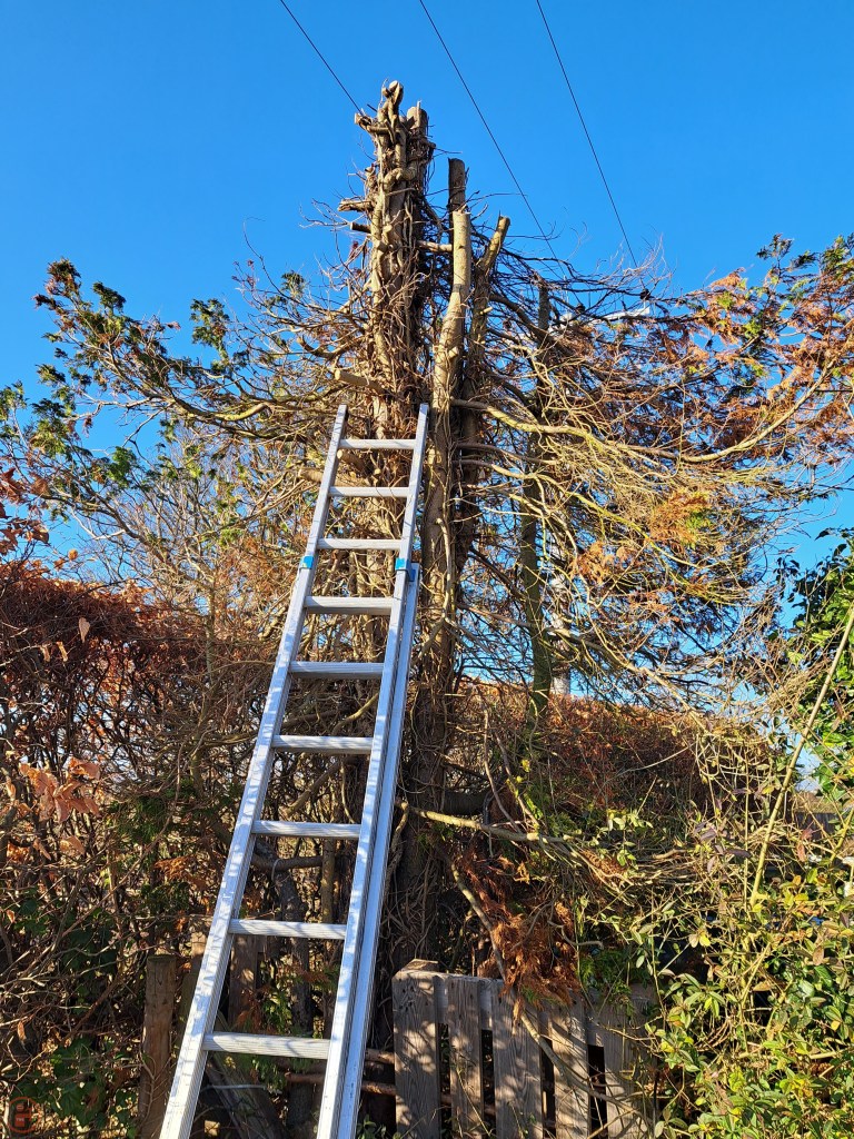 The second tree was a very much alive needle tree, which was particularly bushy. This was a different sort of challenge, in that the trunk was so much smaller there was no where specific to lean the ladder against. We found the densest part of the tree and leant the ladder against that, sinking through the branches until I was partially leaning on the trunk! This only needed a small section removing from the top, which was being blown in the wind and getting close to the wires. Half a second later and the thin trunk was trimmed and the cut-off piece lowered down to Dad below.