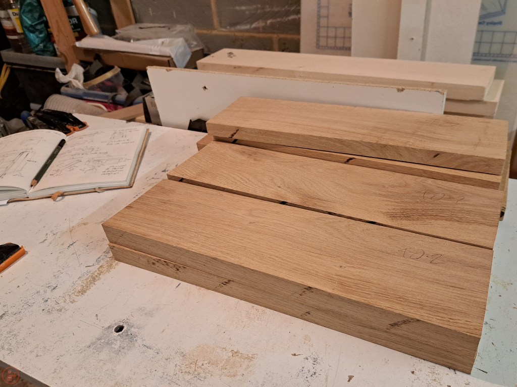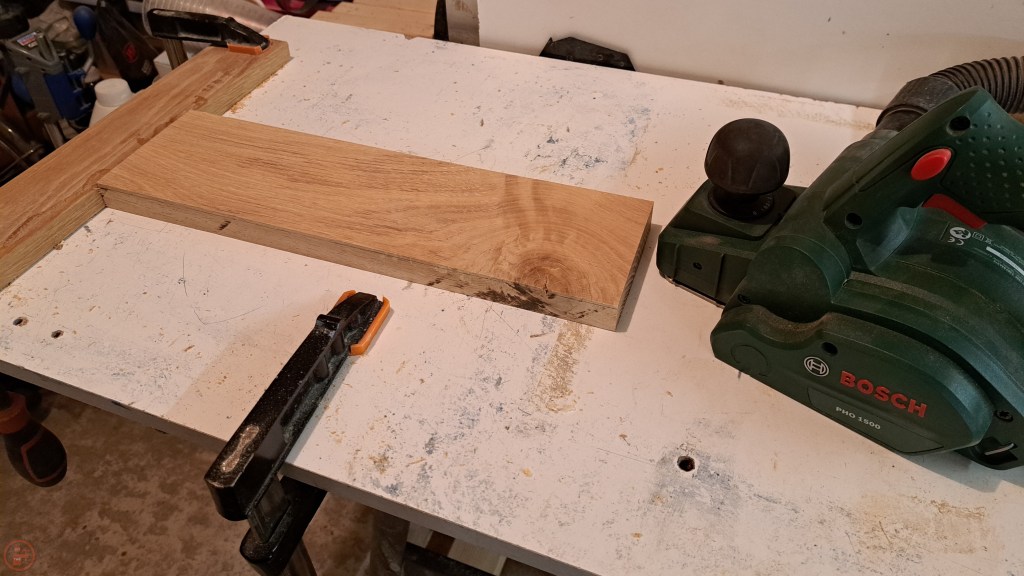 Once I had the oak and basswood safely home again, I cut the various pieces I needed to length and width, and then used my electric hand plane to thin the various pieces down to the required thicknesses. This removed some of the rougher areas of the oak and left a really nice smooth surface.