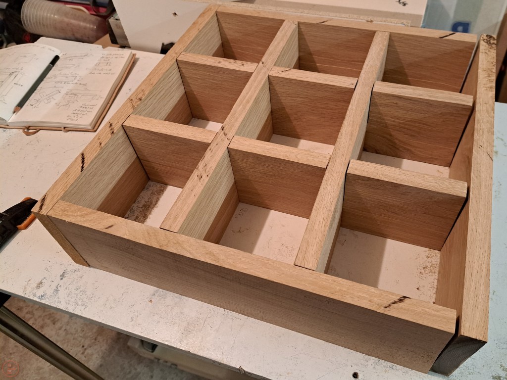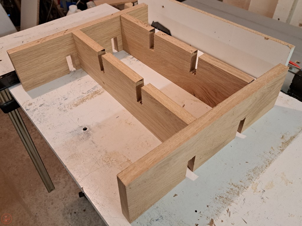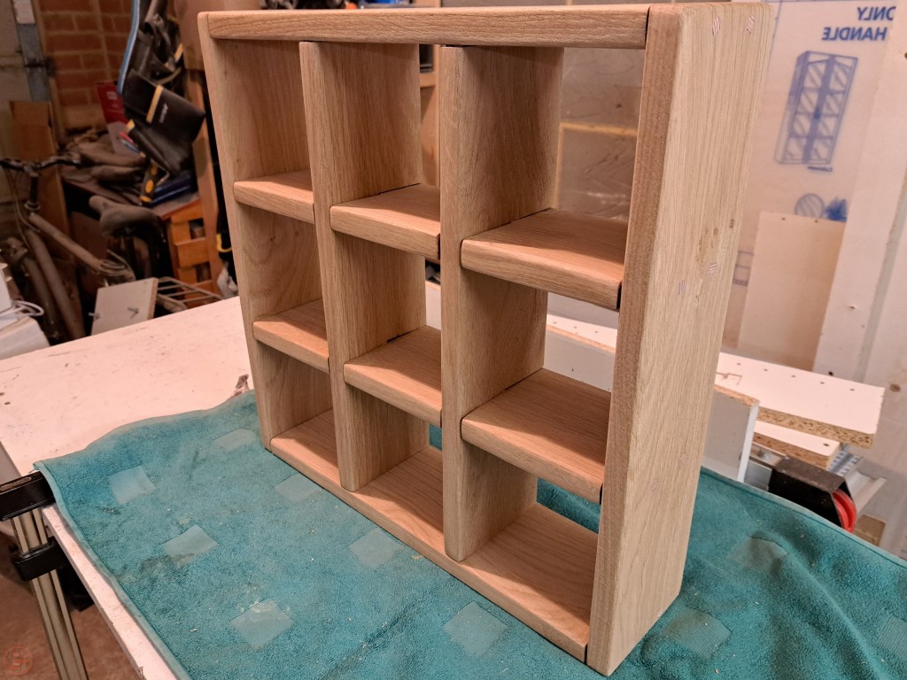 I did a full dry-fit before applying any glue, so I could make sure the whole frame and interlocking sections went together smoothly. I designed the centre frame to interlock to the vertical and horizontal shelves, and then that to be secured to the outer frame using dowels.