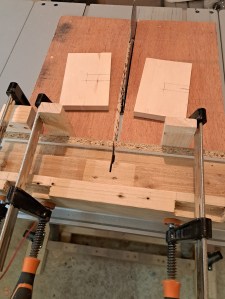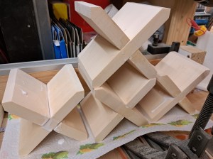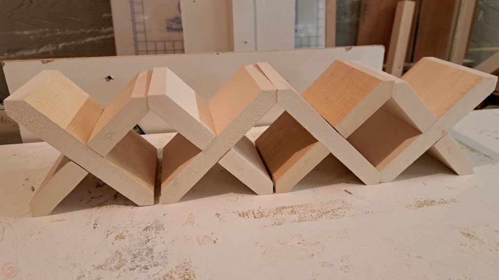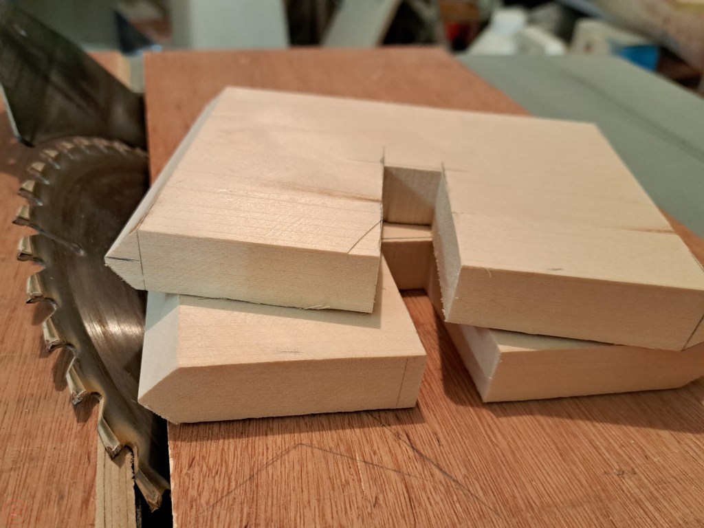 I then turned my attention to the crosses – I measured out the dimensions onto the basswood and then cut out the various pieces, using my table saw to cut the pieces to size, add the notches (using a stop block at each side to aid getting the cuts the right width) and then cut the 45 degree angles on each end by tilting the table saw blade, aligning each piece and carefully cutting each side on each end.